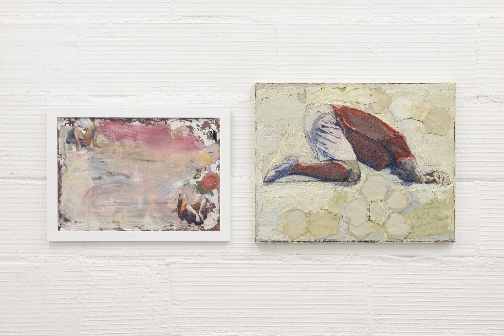 En la segunda sala, hay dos pinturas de futbolistas que tienen que ver con la encarnación de la derrota en público. Las imágenes de jugadores derrotados tienen una existencia bastante fluida y fecunda en la esfera pública, en los periódicos, la televisión o la mitología infantil. Hay algo digno y ejemplar en ellas. Dado que claramente estamos perdiendo en lo político y lo social, el artista se interesa por estas imágenes que parecen dar a la derrota y al fracaso un lugar en la vida pública, cierta tracción, cierto léxico, cierto repertorio gestual, un punto de partida sobre el que construir.