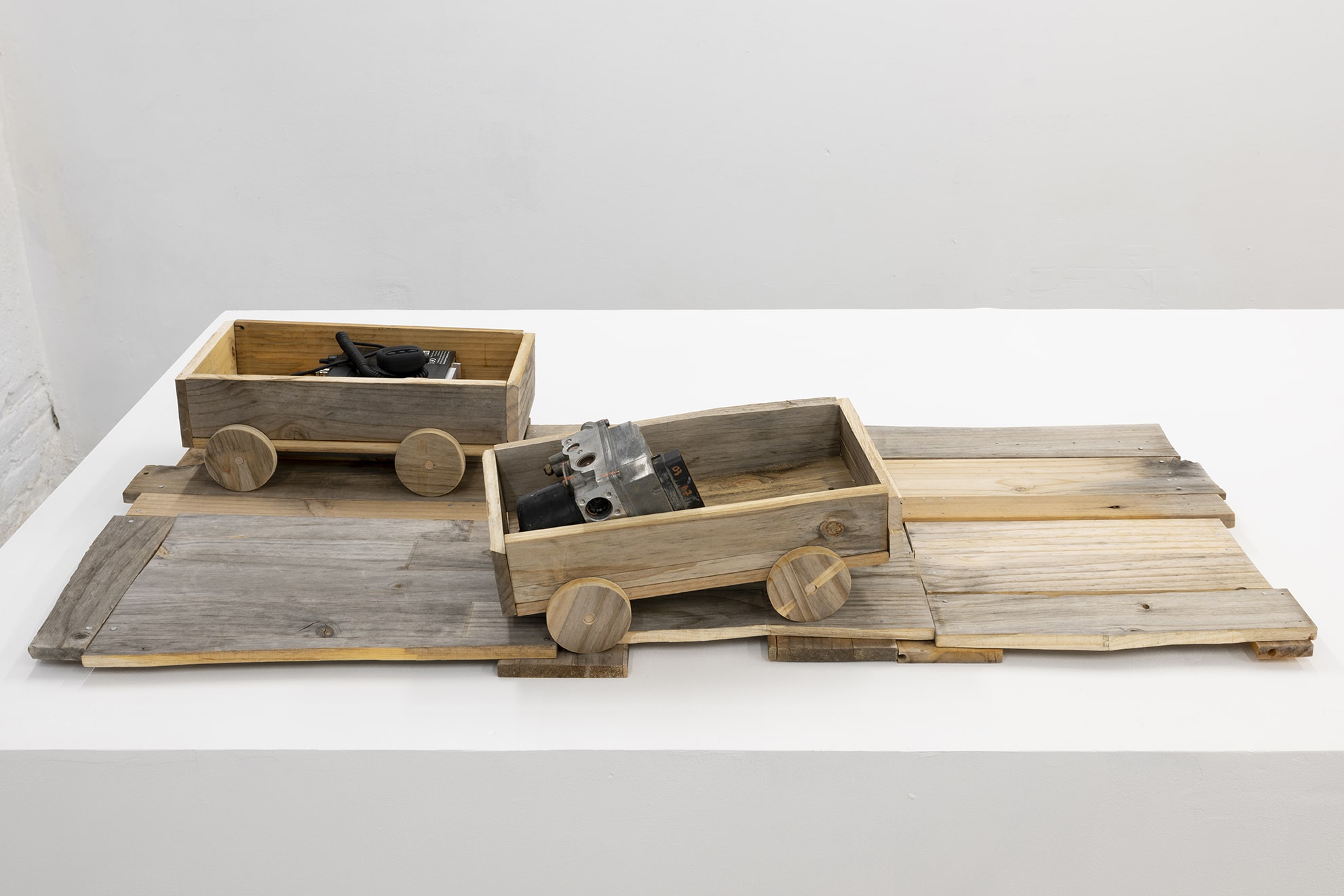 Comprised of twelve photographs, this show skims the surface of Mohammed Abd Alwasi’s general practice and focuses tightly on images he made of his sculptures or assembled objects. Working most commonly in performance, Abd Alwasi usually makes site-specific pieces in and around the city of Hilla, Iraq, where he lives, located about 100 km south of Baghdad near the ancient ruins of Babylon. This region is situated directly in a tumultuous conflict zone and has been the site of numerous atrociously violent attacks since 2003 which have killed thousands of people and all but flattened much of the city. Generally he longs for peace and works through art in an attempt to speak the truth of his situation, and of the situation in this region, seemingly in a state of perpetual civil war. Seeing as the performances are very much rooted in their location, the images on display here function more as entry points: like isolated props from a piece of theater, they provide an addendum to his larger project.
