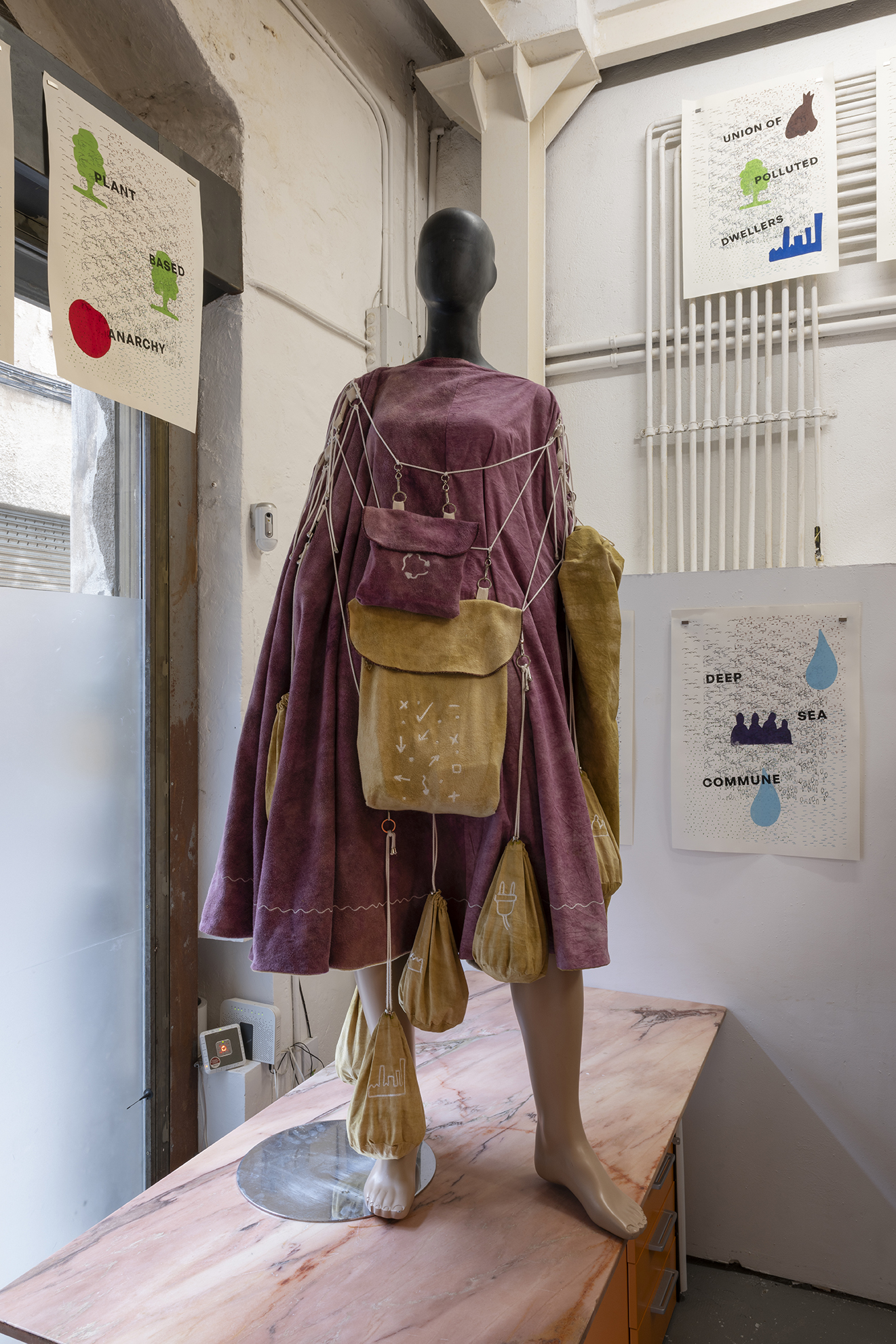 The exhibition and performance, although informed by Davis’ ideas, is grounded equally through current geo-political conflict, environmental disaster, fantasy, film, and science fiction. Gasser orchestrates the performance as an encounter between three figures and respectively and their corresponding sculptures and objects; the hazmat suited scientist; the time-traveler; and a human wearing a shirt with a United Nations logo. The last character represents the potentiality of a global representative institution like the UN to actively facilitate a coexistence between humans and earth itself, irrespective of national interests. The work materializes and at times breaks from the limits of, our terrestrial reality and imagines a coalescence between forces, of and outside of, this world and time.