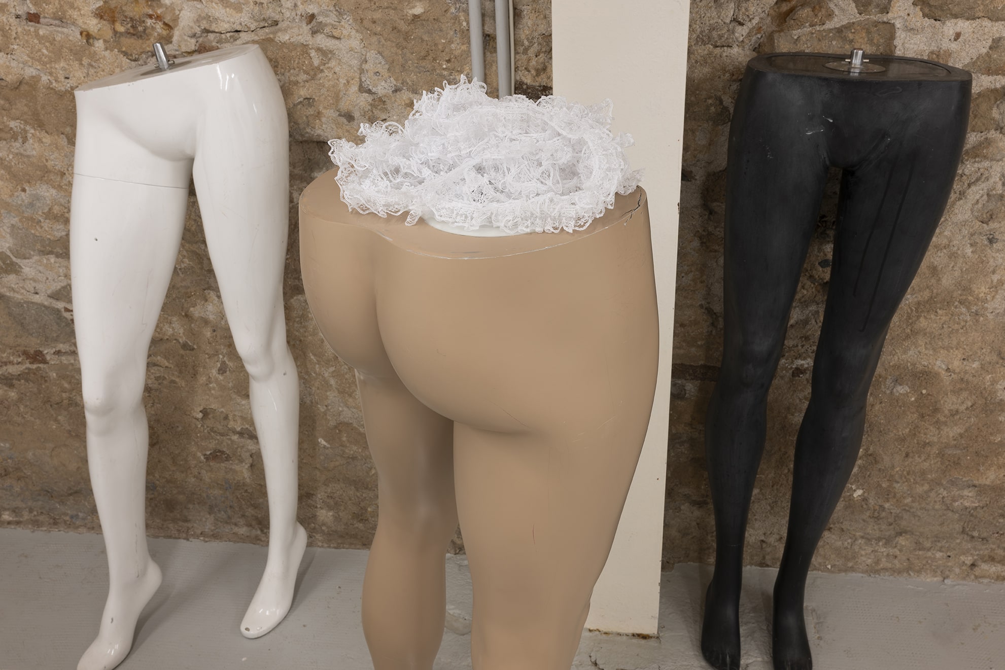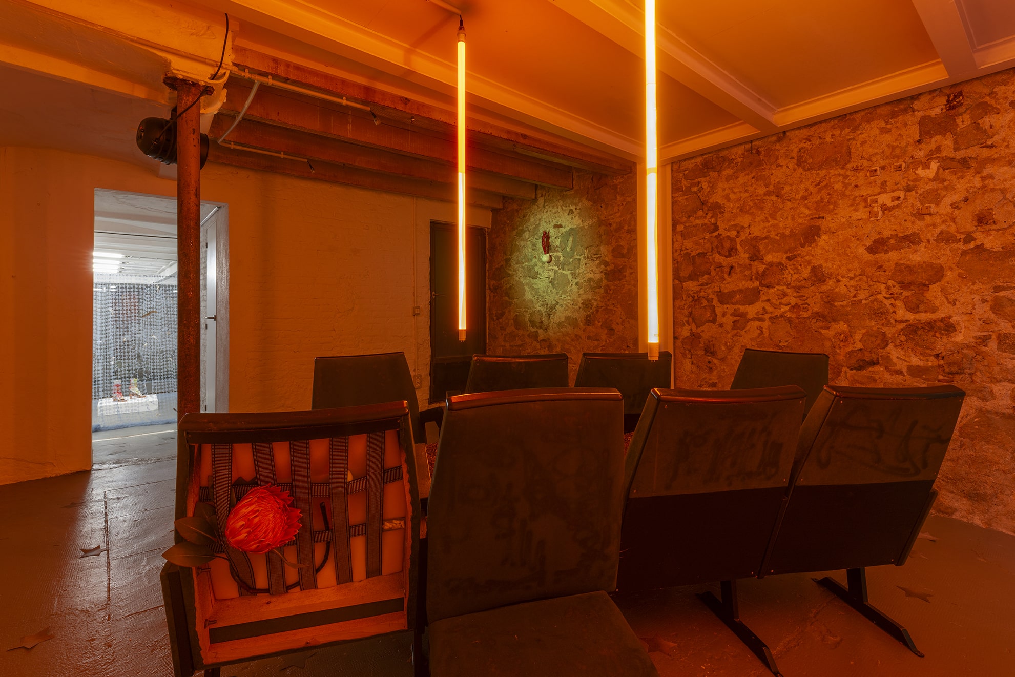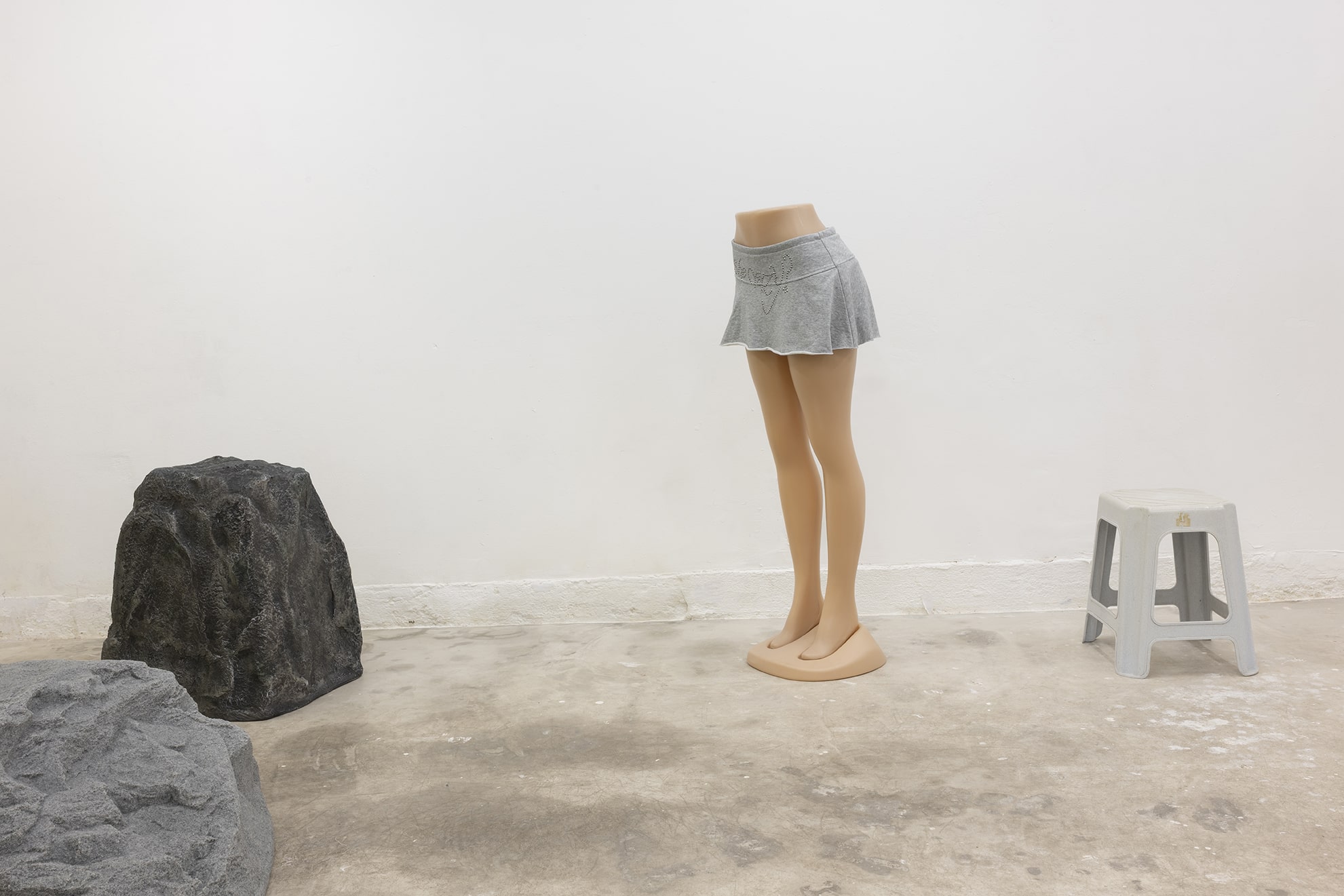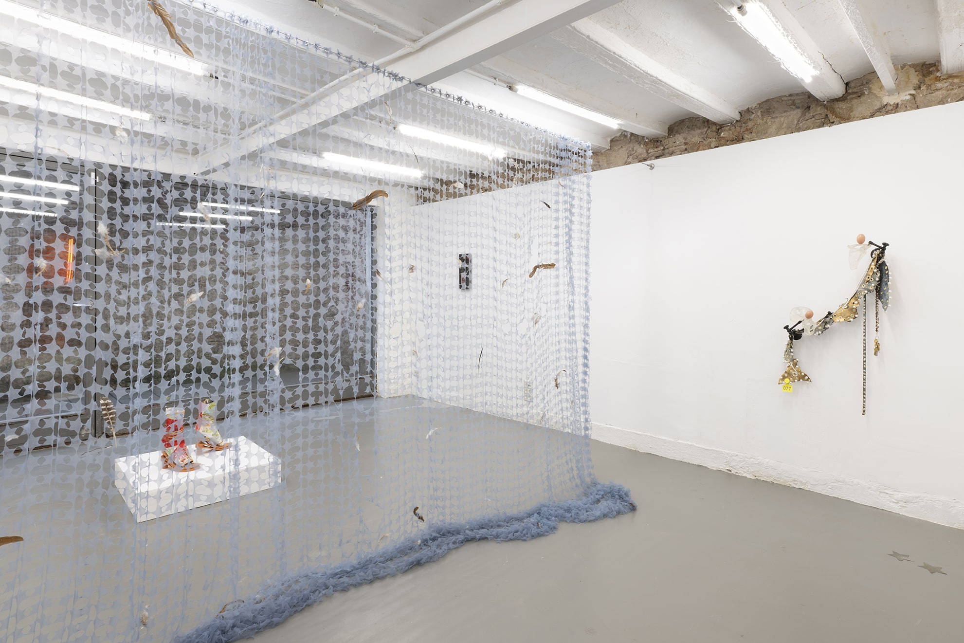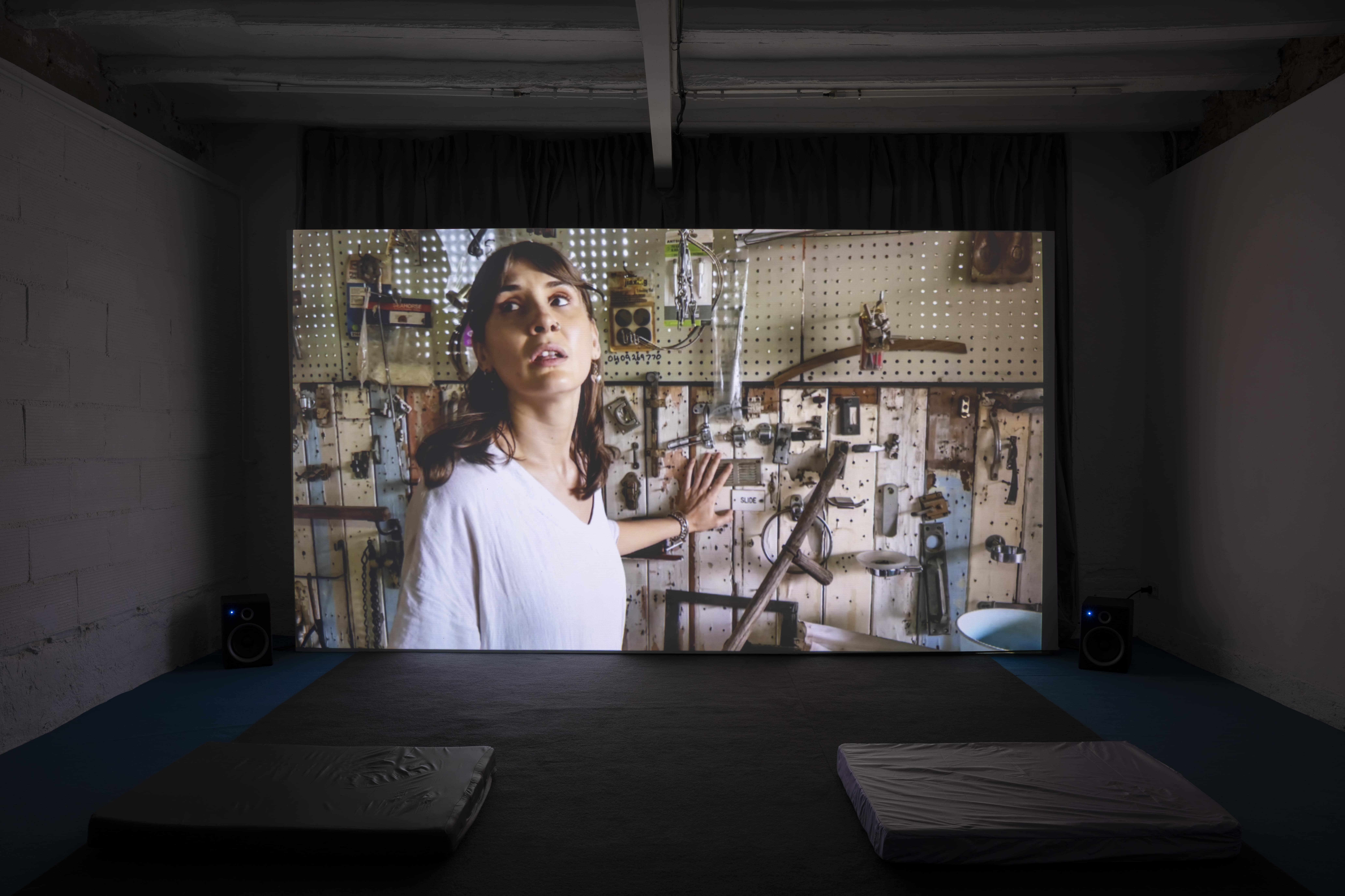 Mitjançant una sèrie d'arranjaments escultòrics híbrids, els elements teatrals que normalment queden relegats a un segon pla es reinterpreten com a intèrprets estàtics imbuïts d'agència. Aparells, telons i seients —relíquies d'innombrables trobades— s'ancoren en materials orgànics com ara ossos de resina, pell de ratlla i quitrà volcànic. En estat de suspensió, aquestes formes exposen la tasca psíquica de l'observació i el fetitxisme que lliga el públic a la performance. Al llarg de les dues sales de la galeria, les obres tracen les transgressions episòdiques de feminitat respectable de la madwoman, revisant manuals de domesticitat i creació d'espais amb gestos que desafien la contenció.