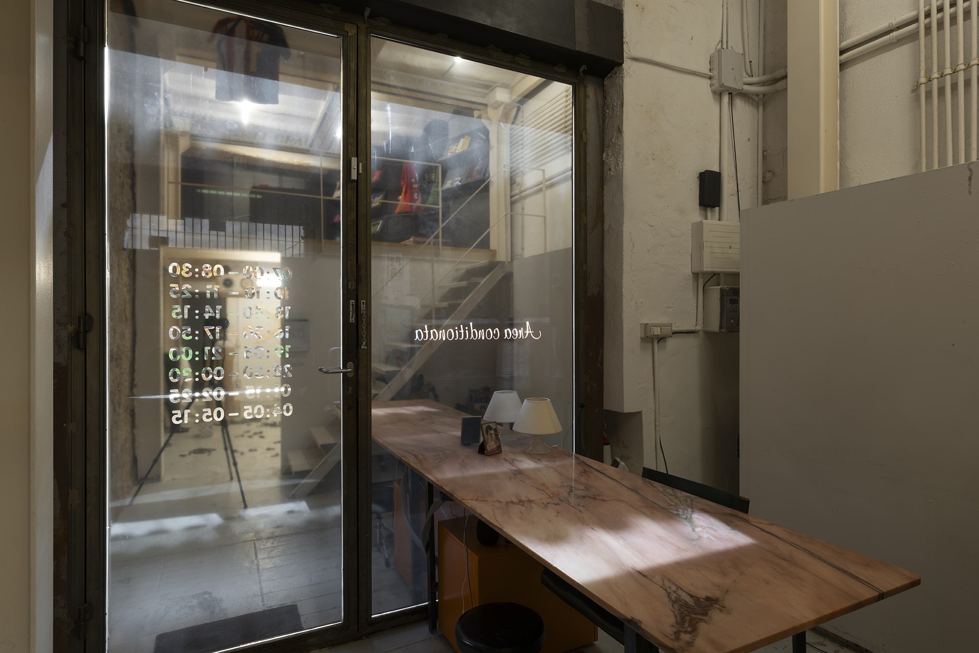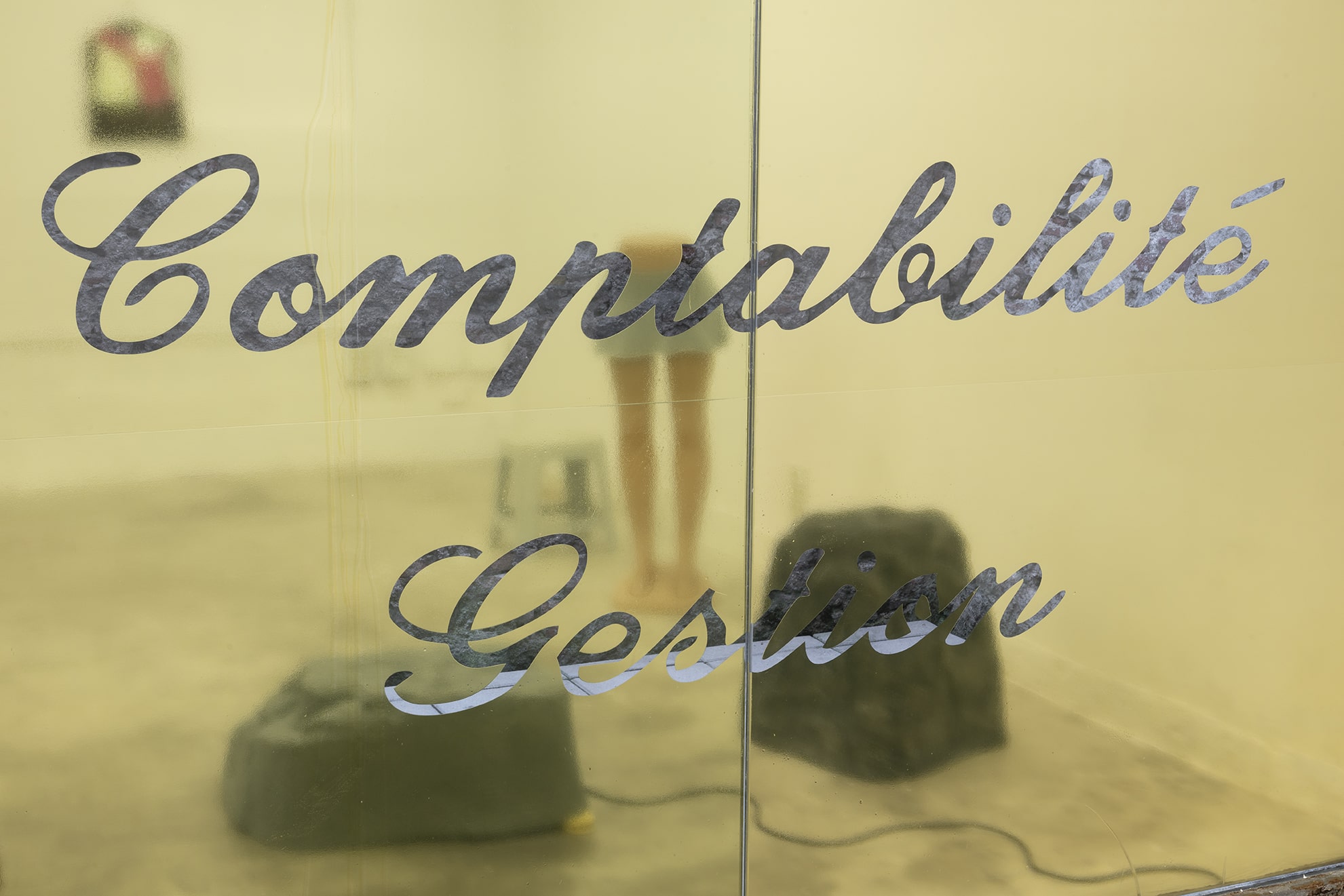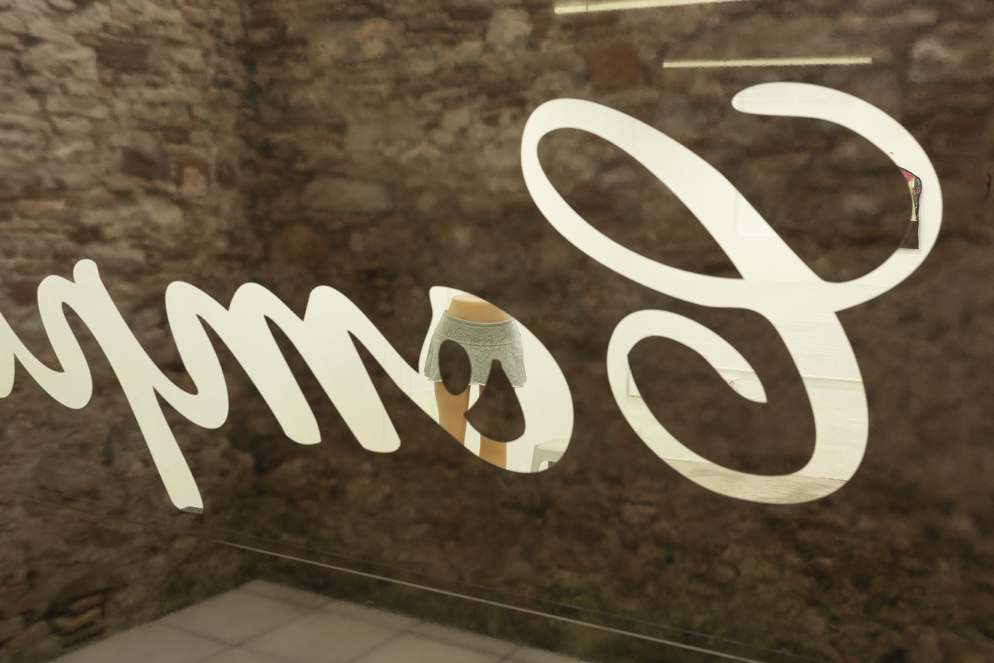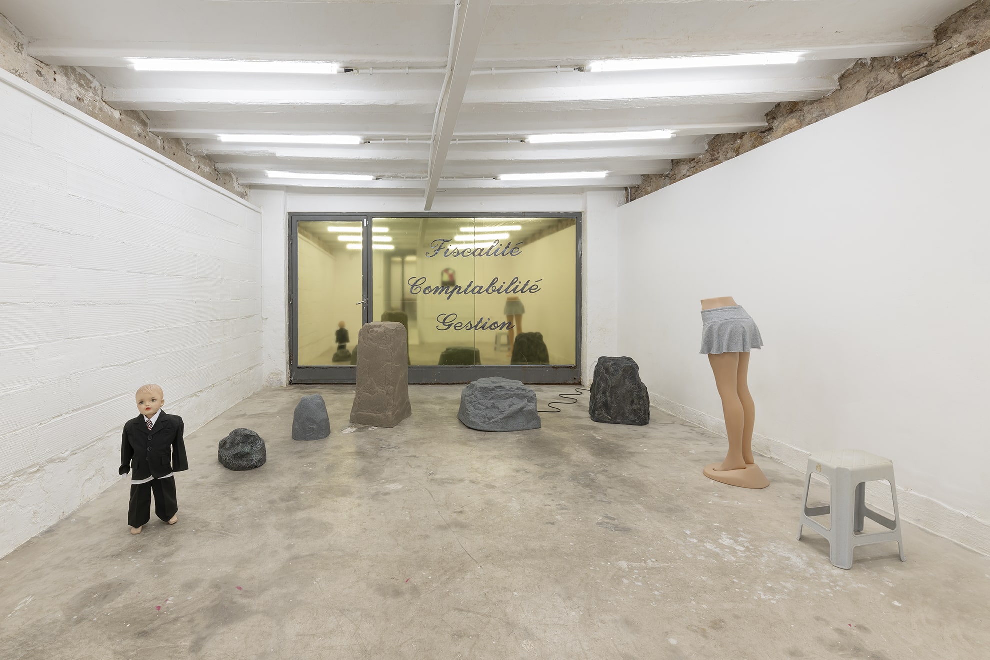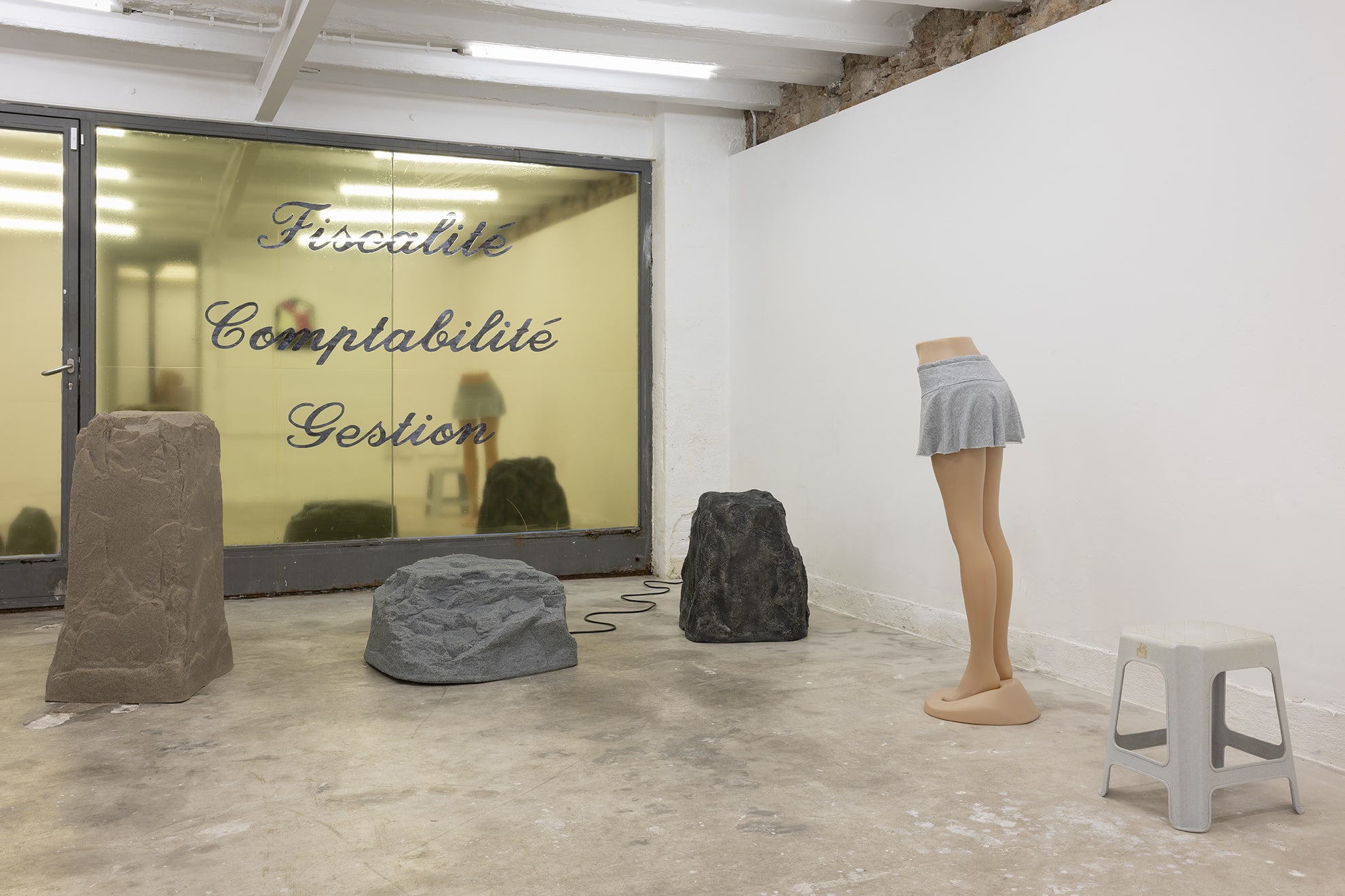 Duty Free is a site-specific exhibition by multidisciplinary artist Jiajia Zhang. Using installation, sculpture, found objects, sound, vinyl window coverings and text the artist stages a strange and temporary storage space. A place for discarded goods and wholesale products, found furniture and altered objects, past memories and future predictions. Fragments of music and voices speaking in different accents can be heard emanating from some of the objects scattered throughout the space. The voices read an incomplete inventory of mundane activities and daily chores. While the listed activities are both banal and specific, both busy and stagnant, the objects – which usually are traded, delivered, exchanged, discarded, or recycled – lie peacefully still, covered, uncovered, withstanding for a moment the erosion of time. Zhang asks questions about abandonment and entertainment, bureaucracy and care.