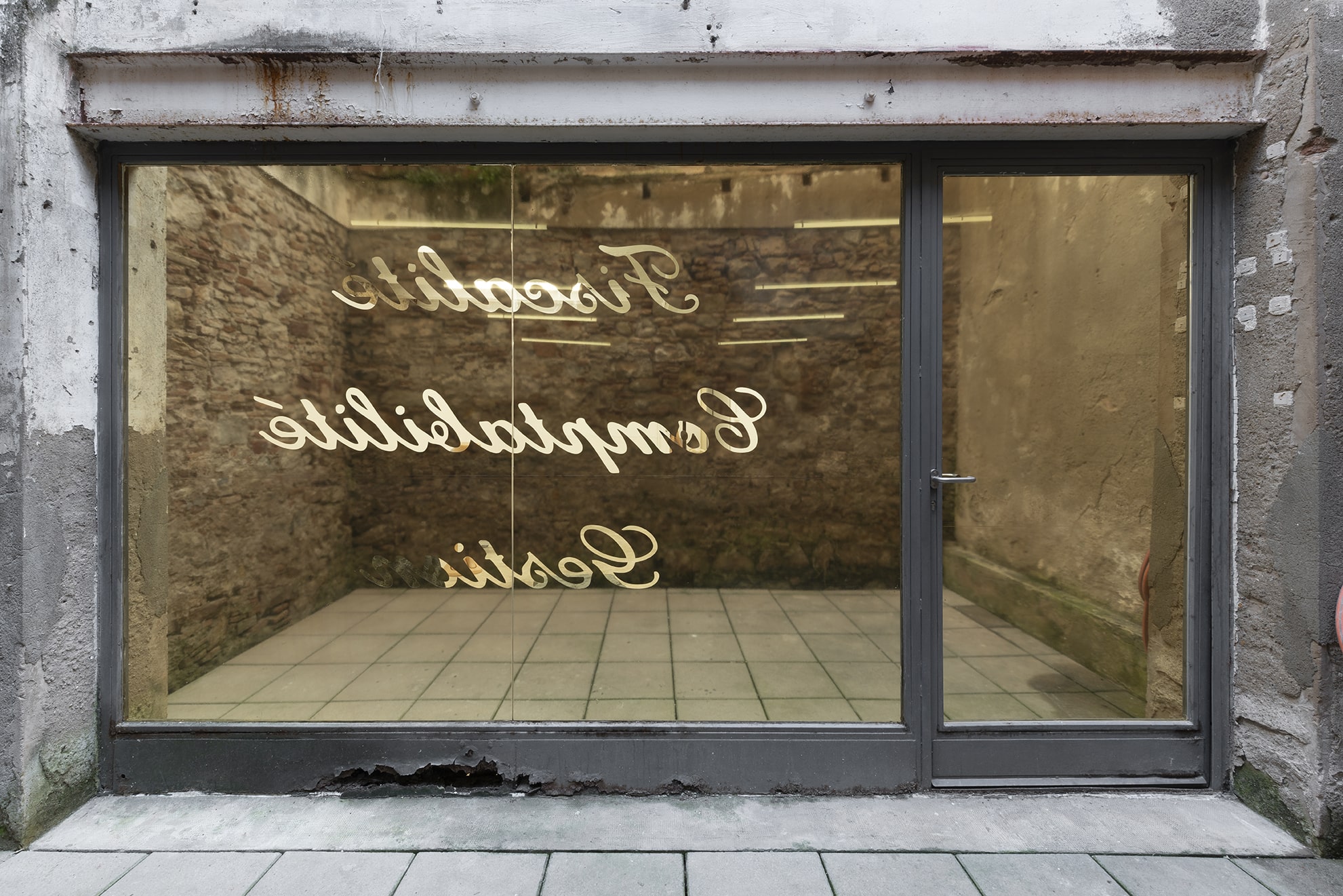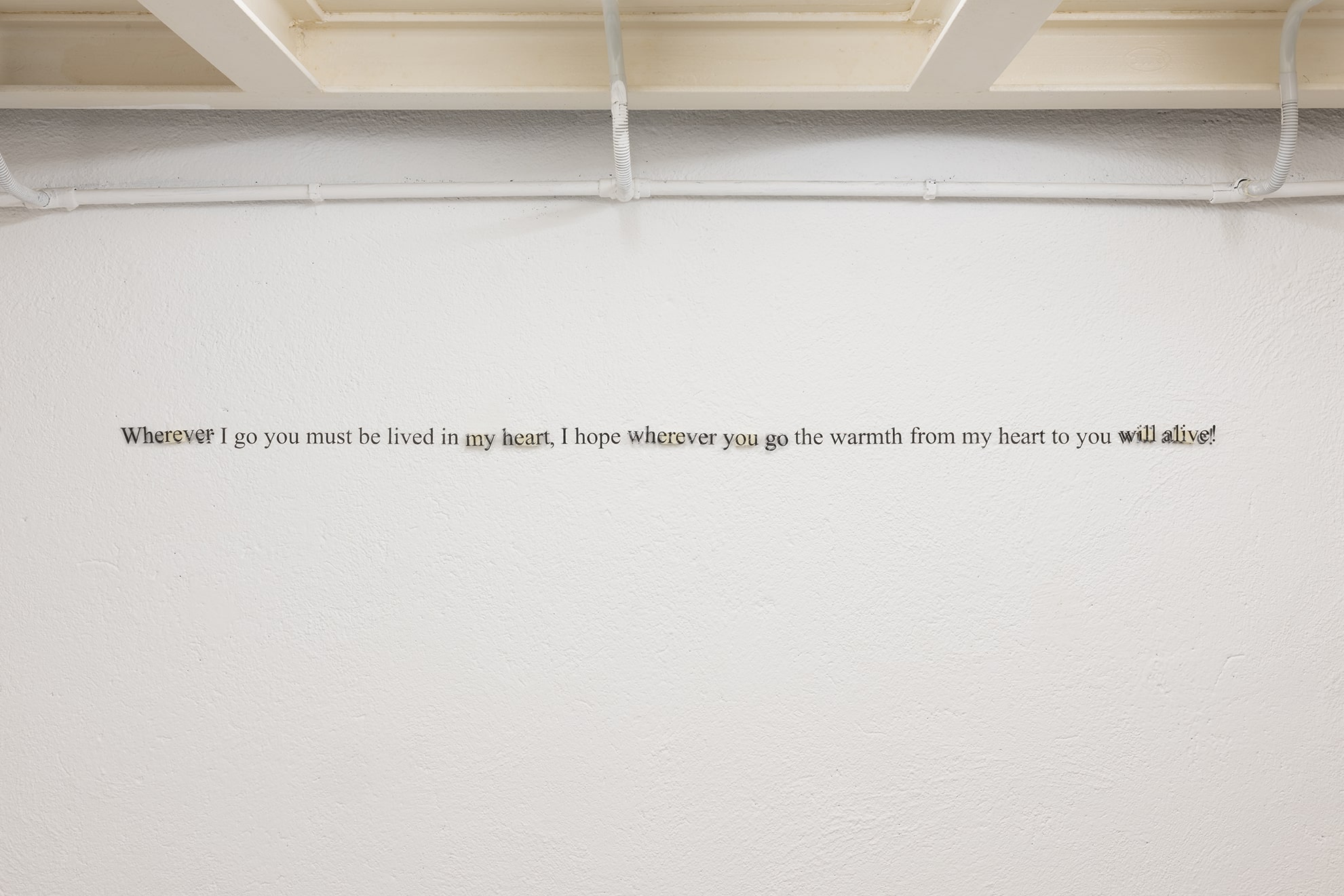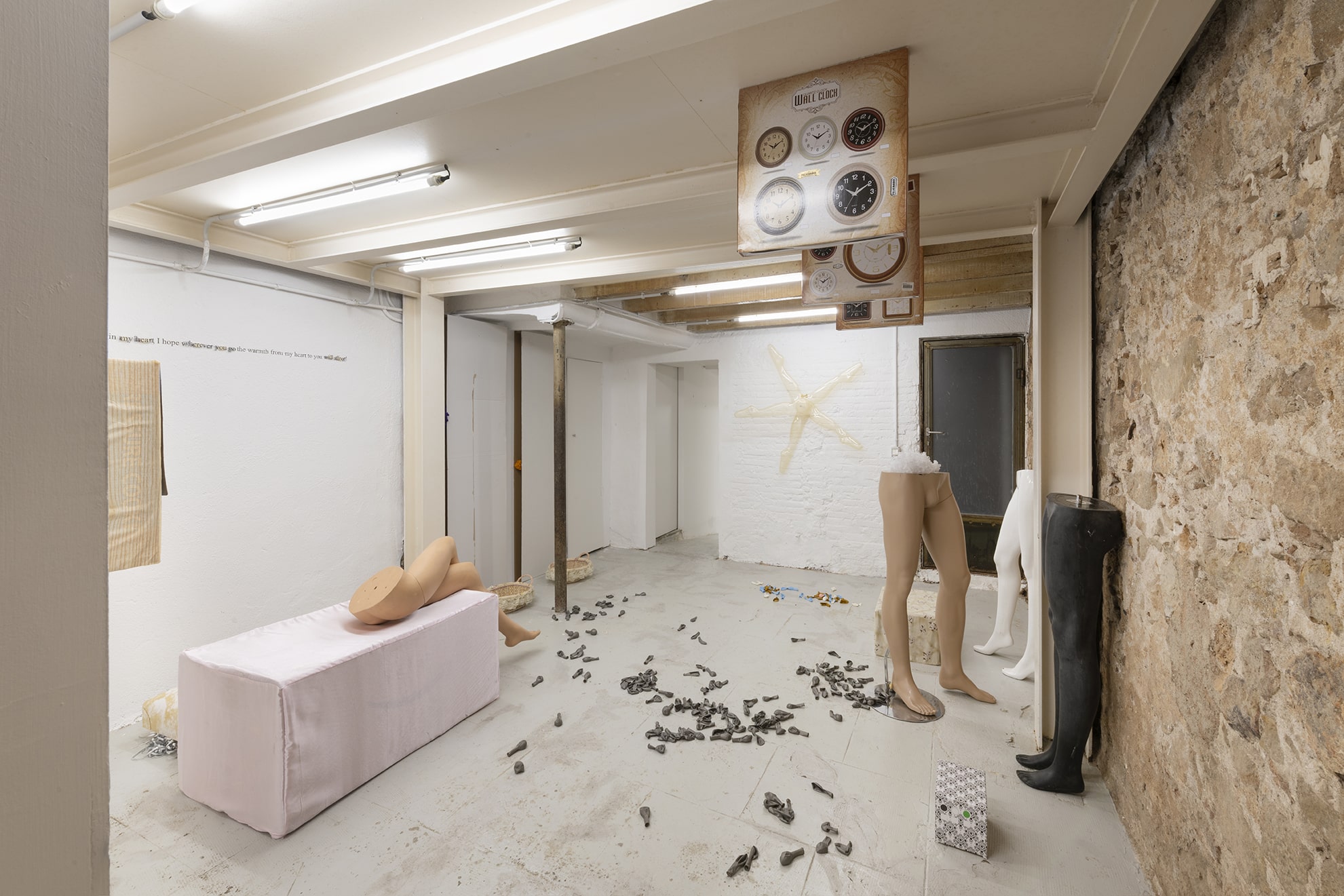 The show centers on a dialogue depicting the dissolution of a long distance relationship. It explores inherited cultural behaviors and the prescriptive narratives engendered within the environments we move through and around, and their impact on the ability of the individual to express and communicate. The architectures of the two galleries – both of which also function as domestic spaces – become the embodiments of physical and psychological distance as the conversation intensifies and the pressure of language builds around strained efforts at being ‘true to oneself’.