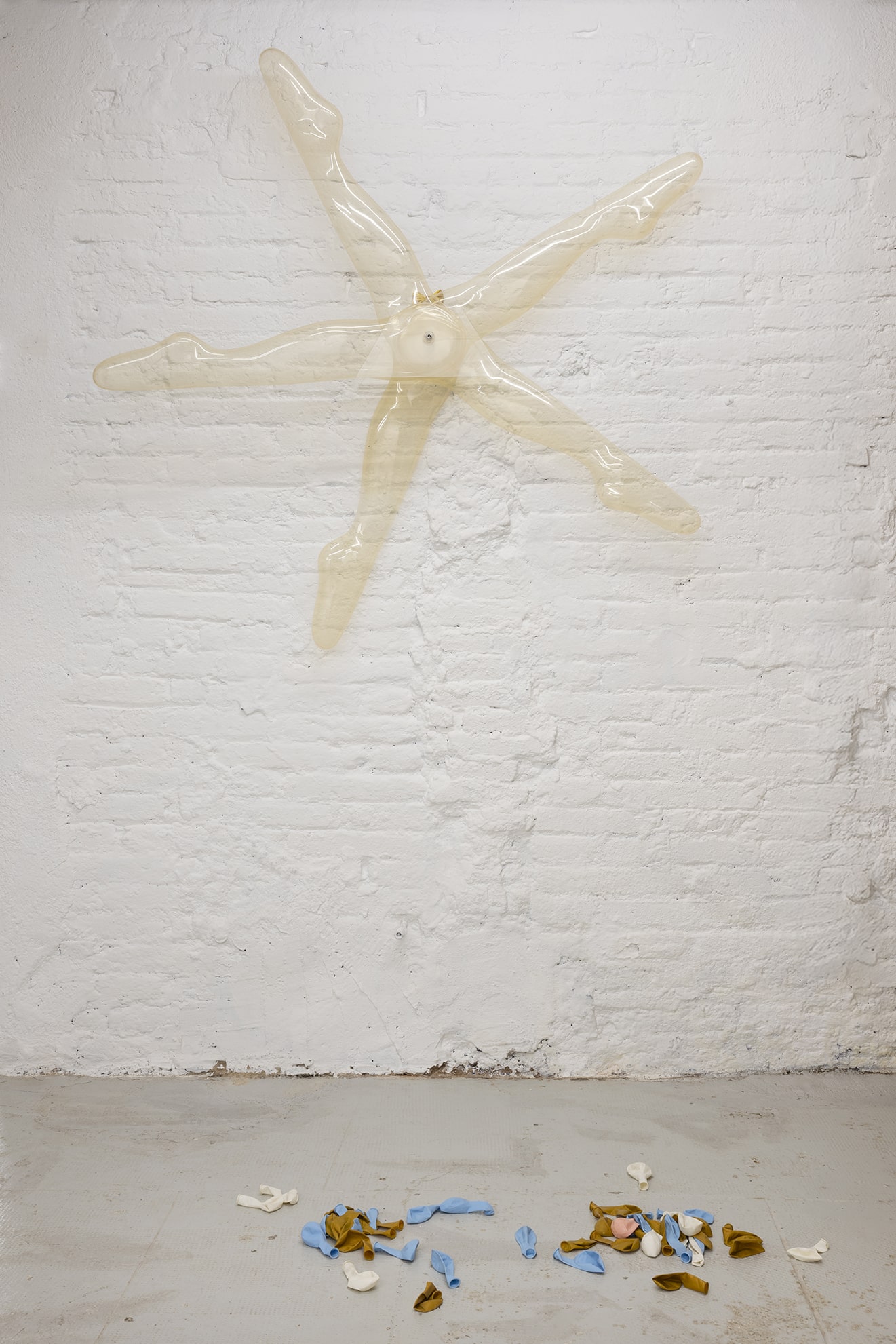 The yellow sculpture is a canary lung, a medical resuscitator adapted to have three bags of air – like the lungs of a canary – rather than just one. The artist is interested in the hypersensitivity of these animals to their environment, the vulnerability that comes from an extra airy respiratory system. Carbon monoxide knocks the birds out in a second, which is why miners took them down with them to the mine in case there were leaks. This sensitivity is paradoxically also what allows them to sing so beautifully.