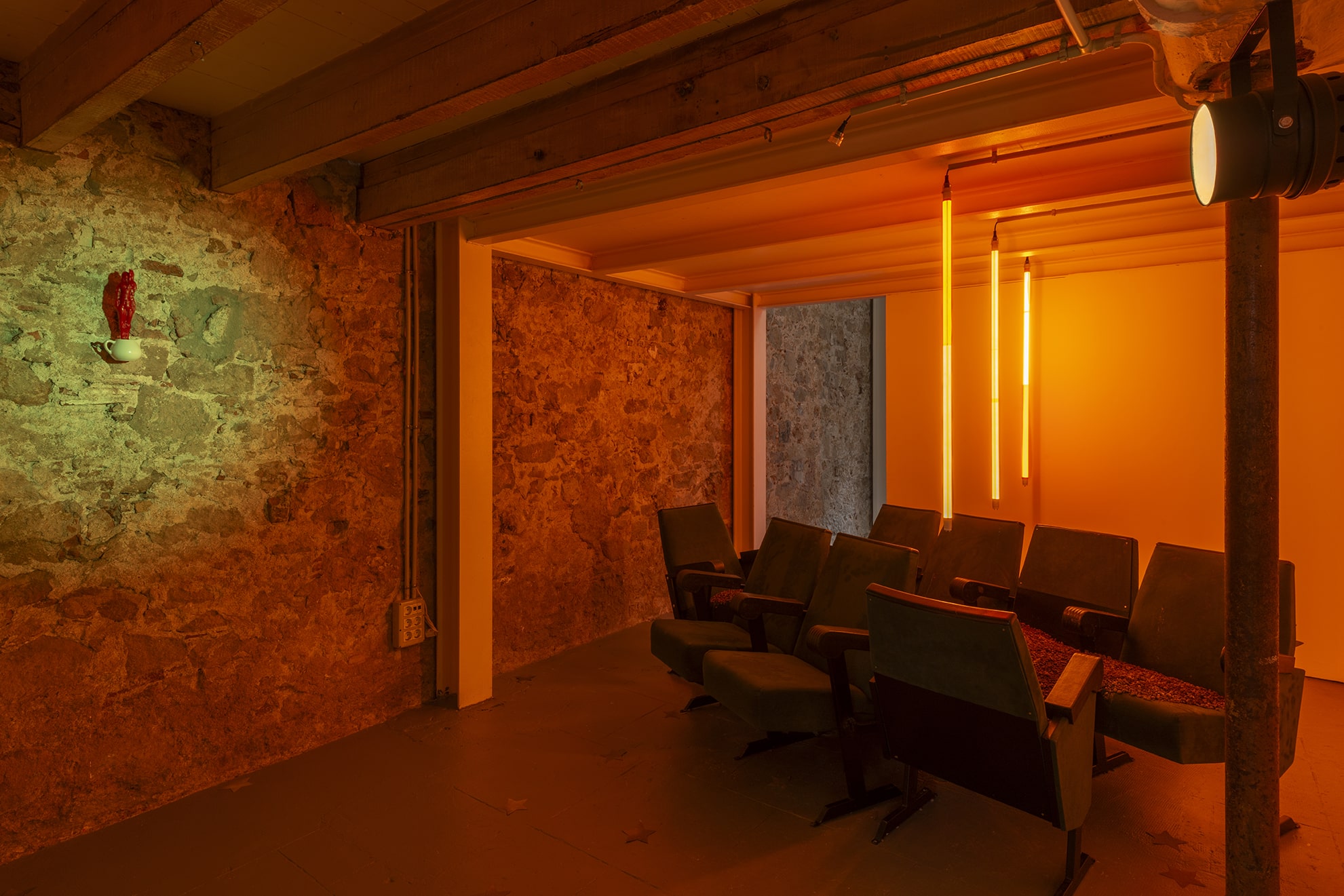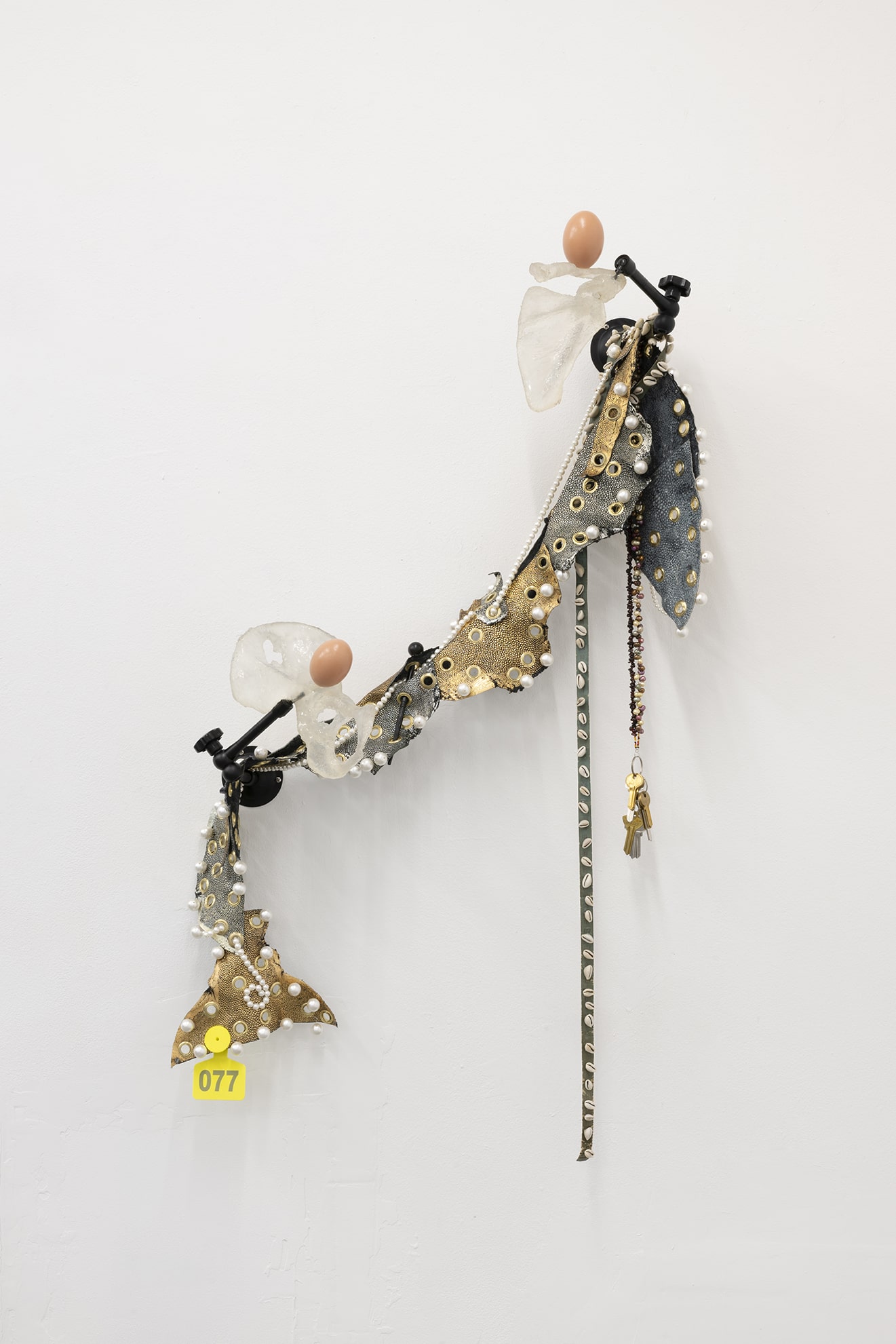 Through a series of hybrid sculptural arrangements, theatrical fixtures that usually recede into the background are recast as static performers imbued with agency. Rigging, curtains, and seating—relics of countless encounters—are tethered to organic materials like resin bones, stingray skin, and volcanic tar. In a state of suspension, these forms expose the psychic labor of witnessing and the fetishism that binds an audience to performance. Across the gallery’s two rooms, the works trace the madwoman’s episodic transgressions of respectable femininity, revising manuals of domesticity and place-making in gestures that defy containment.