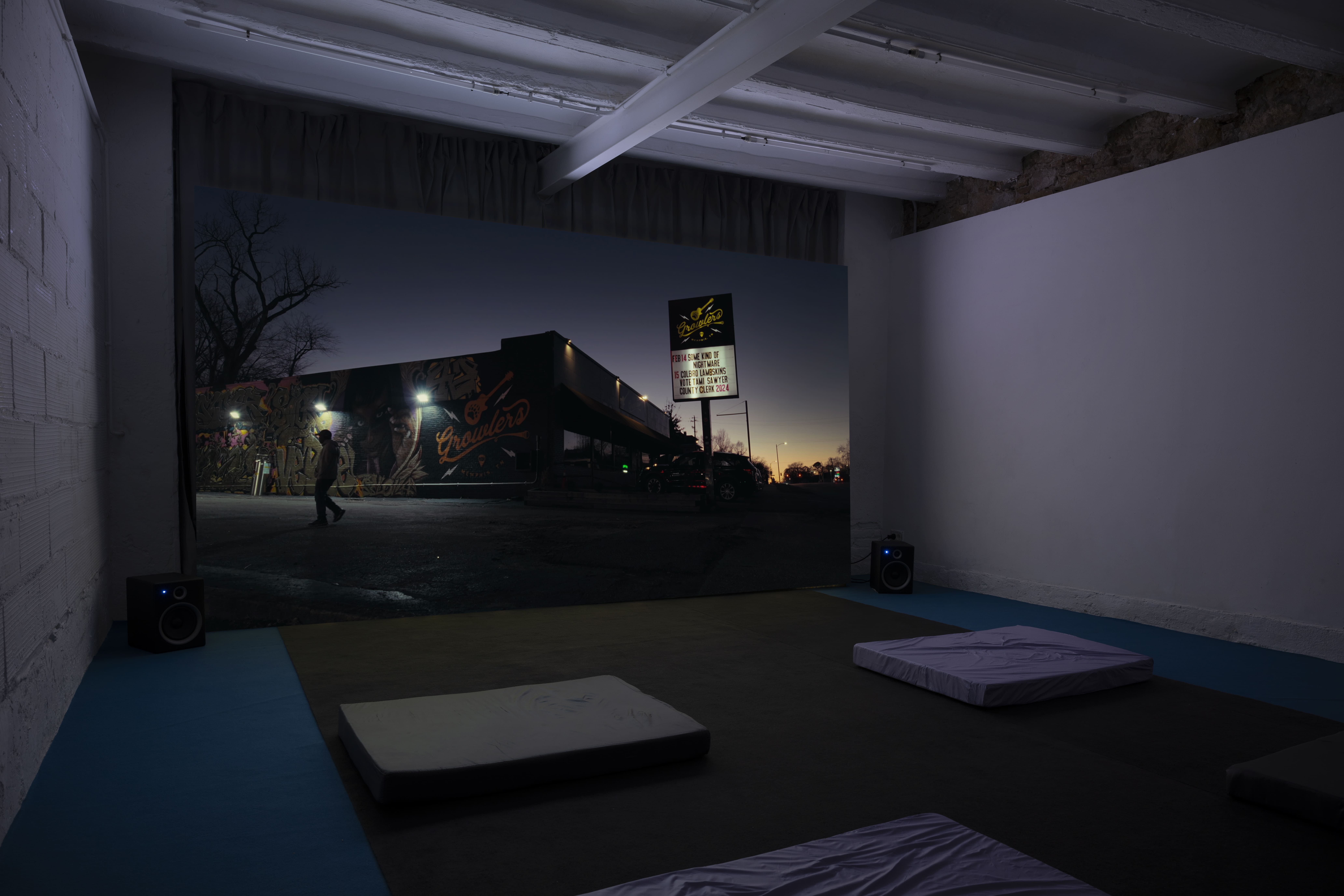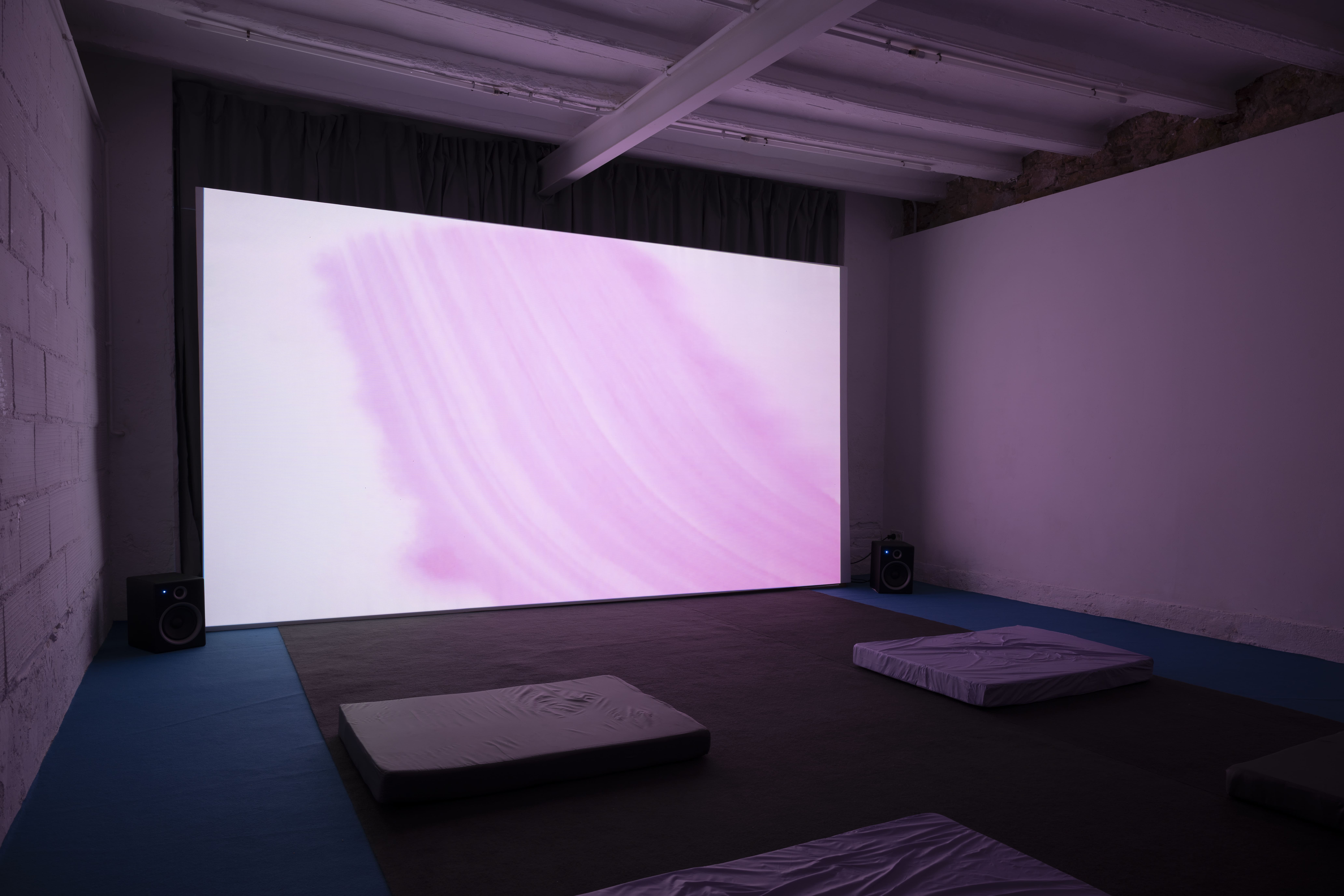 In the first room, with one work extending out into the entrance way, there are three painted sunsets. The artist is interested in the sunset because of how ubiquitous and generic images of them are, relaying beauty and peace which tend to feel deep and one's own when experienced. In the exhibition, they're meant to be welcoming and comforting. Sunset is also the time of lowest cortisol of the day and low cortisol = low anxiety. Two of them are painted on acoustic diffusers. Berdugo is interested in sound because of its acute responsiveness to spatial conditions and also because of his own phobias of many noises. The diffusers are engineered to deflect sound waves in many different directions so as to cancel out physical characteristics of a space. These devices counter echoes, reverberations or any other sonic aberration, maintaining a voice pure in any room, and the diffusers used as substrates here for the paintings are designed to work in a range of frequencies that cover the entire human voice. The sunset in the entranceway is painted on a folded truck curtain, used by truck drivers who spend a lot of time on public roads to make their cabins feel a bit more like home.