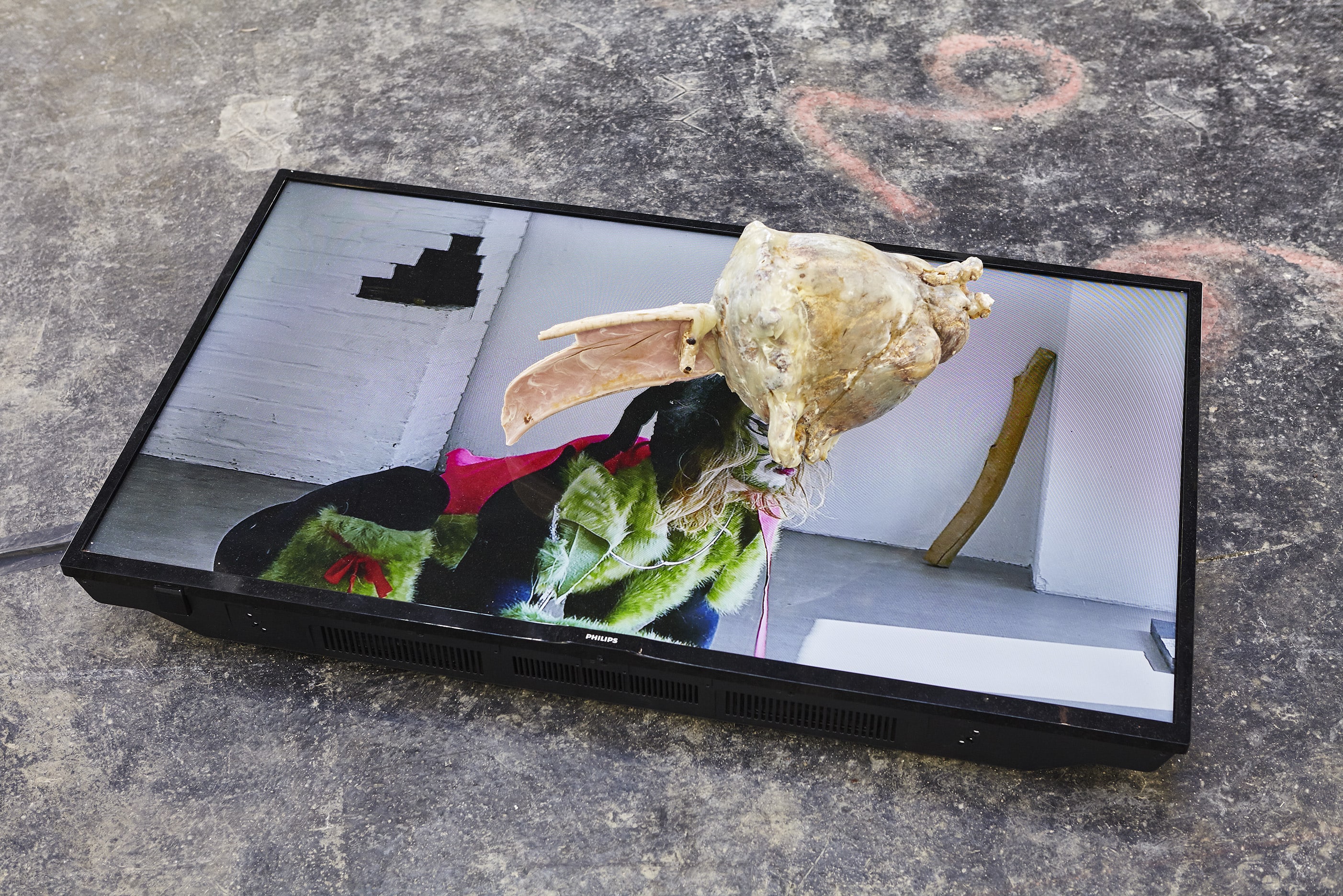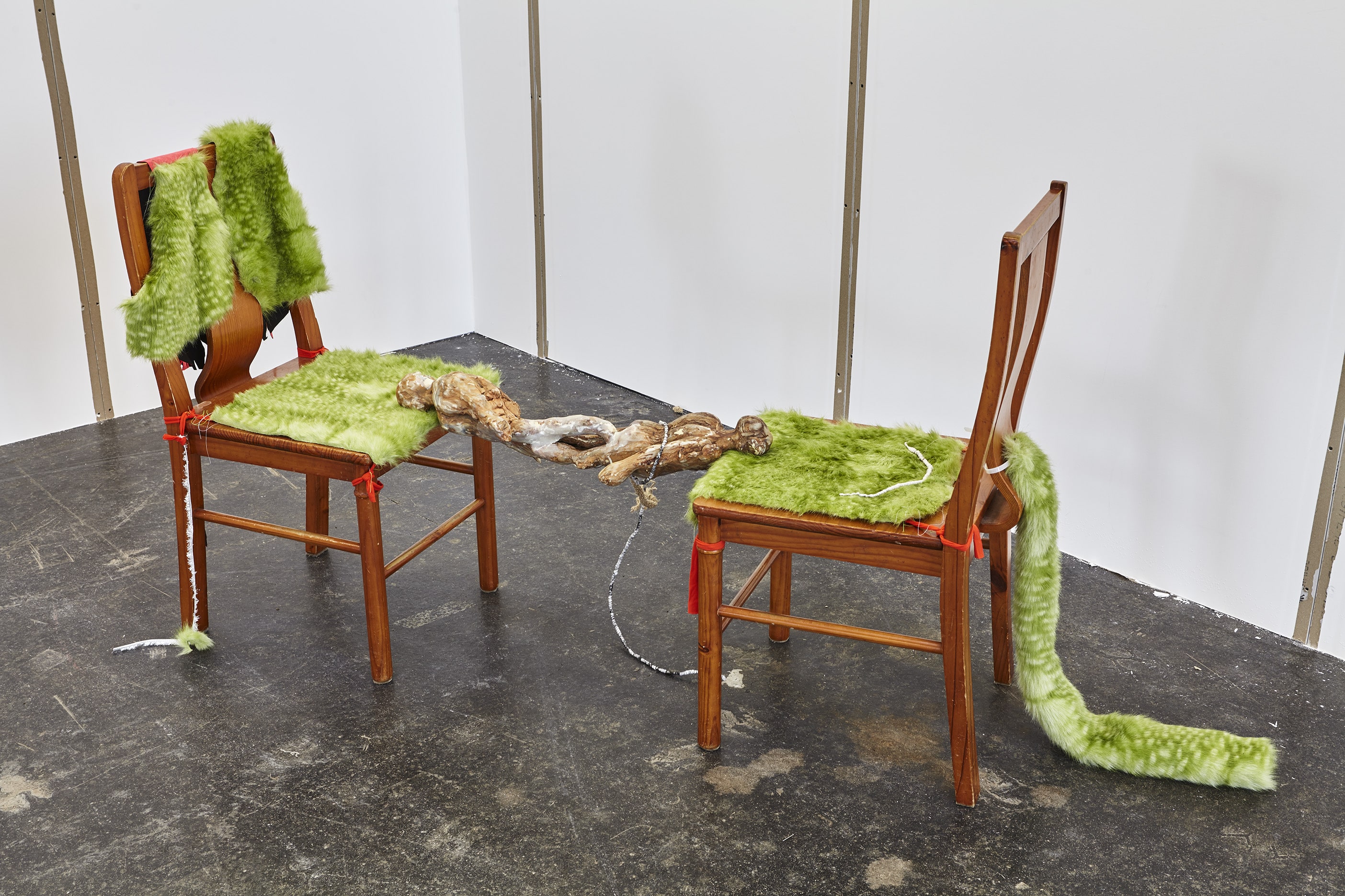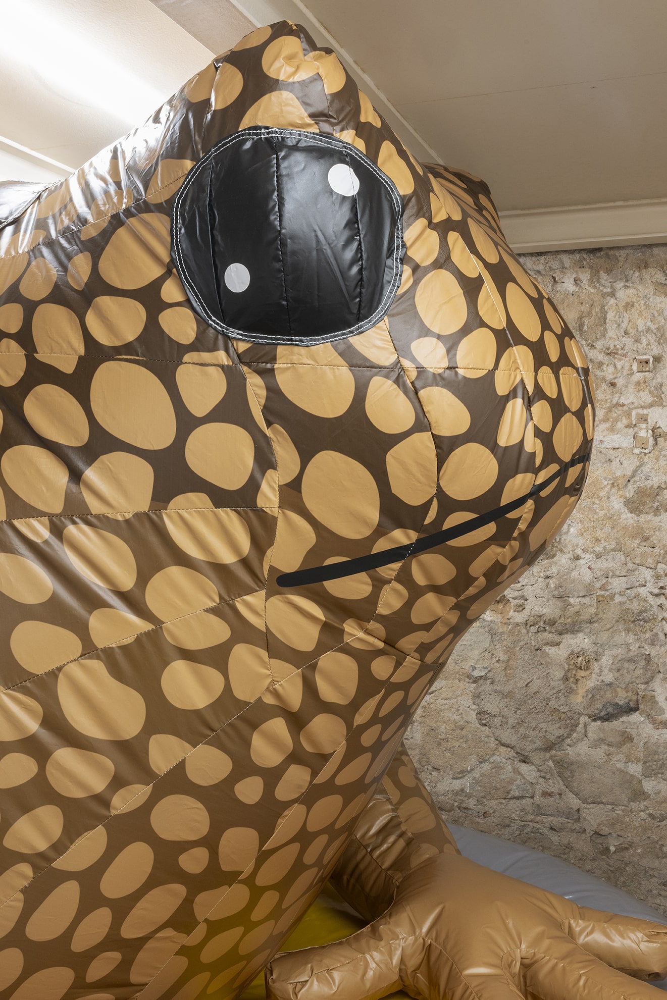 Bad To The Bone is a solo exhibition with two new sculptural works by Emily Jones. In the first room there is a larger than life inflatable toad sat atop an similarly oversized coin. While the toad and the coin may seem disparate, tiny frogs are often photographed on top of coins in order to show their exact size. The coin is a common object that we collectively agree upon as having a certain size (and value) and hence it serves as a reliable reference, a fixed truth verifying the size of often unbelievably small animals. In many instances both frogs and toads are thought to bring good fortune, as is the case with the ‘Jin Chan’ or “money toad," a popular feng shui charm where a toad sitting on a pile of coins is thought to bring luck and prosperity. Scale is a recurrent theme in the artist’s work and in this case the size of the coin and toad duo borders on monumental.