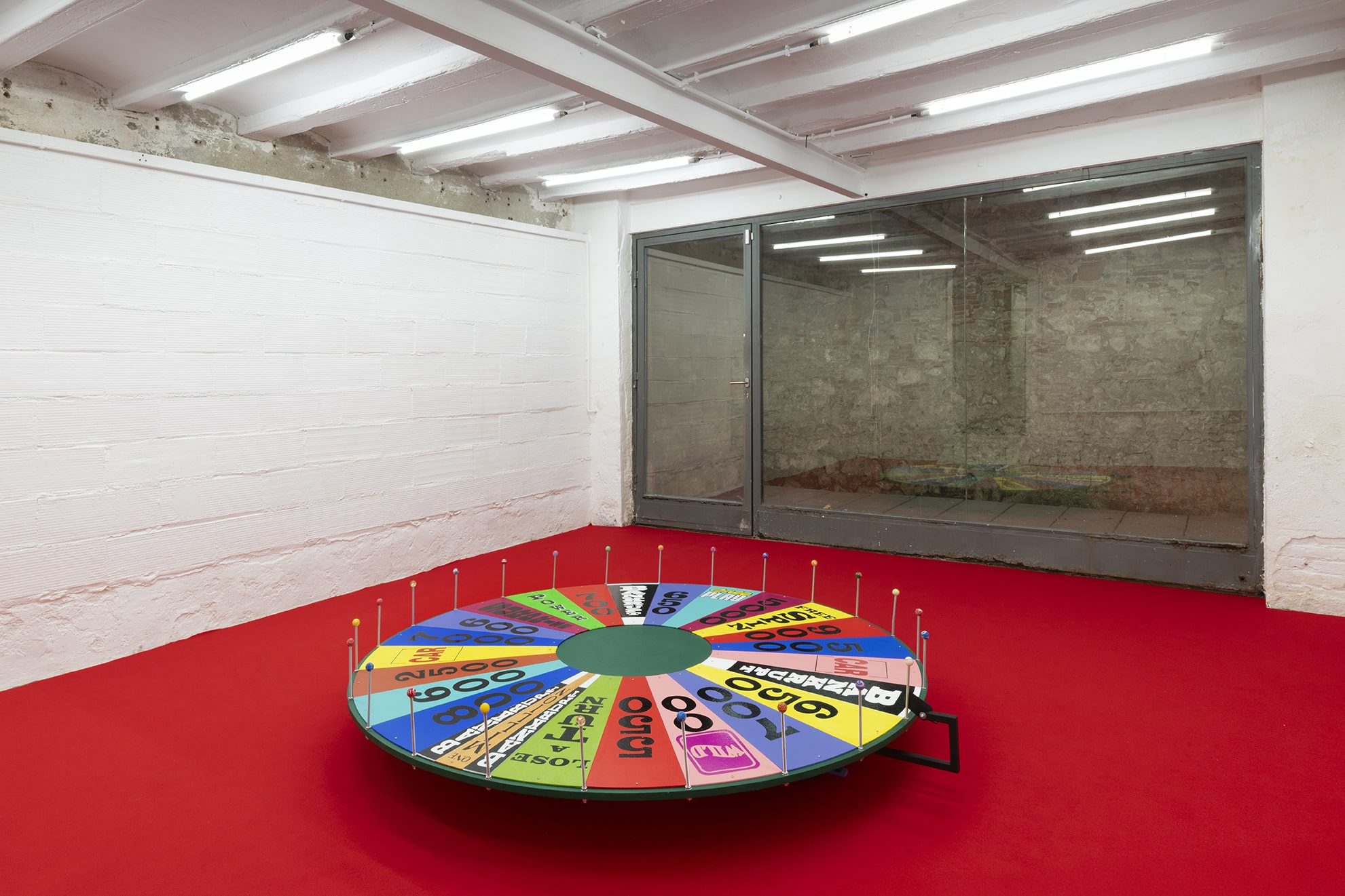 In the second room there is a functional wheel of fortune positioned atop a bright red carpet. The wheel’s proportions and twenty four distinct slices have been modeled as an approximation of the wheel used on “Wheel of Fortune,” a popular television game show in the United States which has been on the air in some form since 1975. The format of the wheel is said to be a mixture of two common casino games: the ‘Big Six’ which is usually positioned vertically and contains various segments and the pins around its border, and the classic Roulette table, where the circular table is spun in one direction and a small ball in the other, eventually stopping on a particular value. Jones chose not to include the dollar sign symbol on the wheel as to allow the numbers to be less tethered to a specific place and currency. While there are no prizes in this version of the wheel of fortune, visitors are still encouraged to take a risk, spin the wheel and to test their chances.