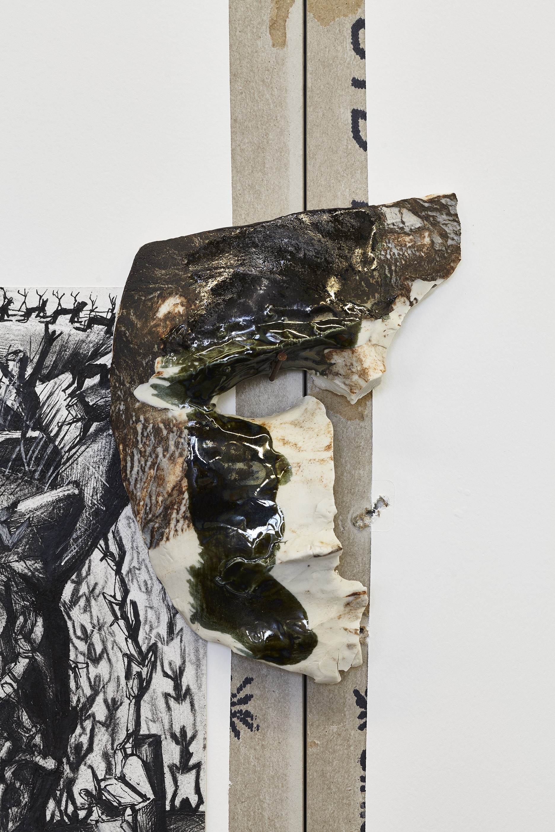 In the next room, there are two paintings of football players that have to do with embodying defeat in public. Images of defeated players have quite a smooth and fecund existence in the public sphere, in newspapers, TV or in children's mythologies. There's something dignified and exemplary about them. Since we're clearly losing politically and socially, the artist is interested in these images that seem to give loss and shortcoming a place in public life, some traction, some lexicon, some gestural repertoire, somewhere to build on from.