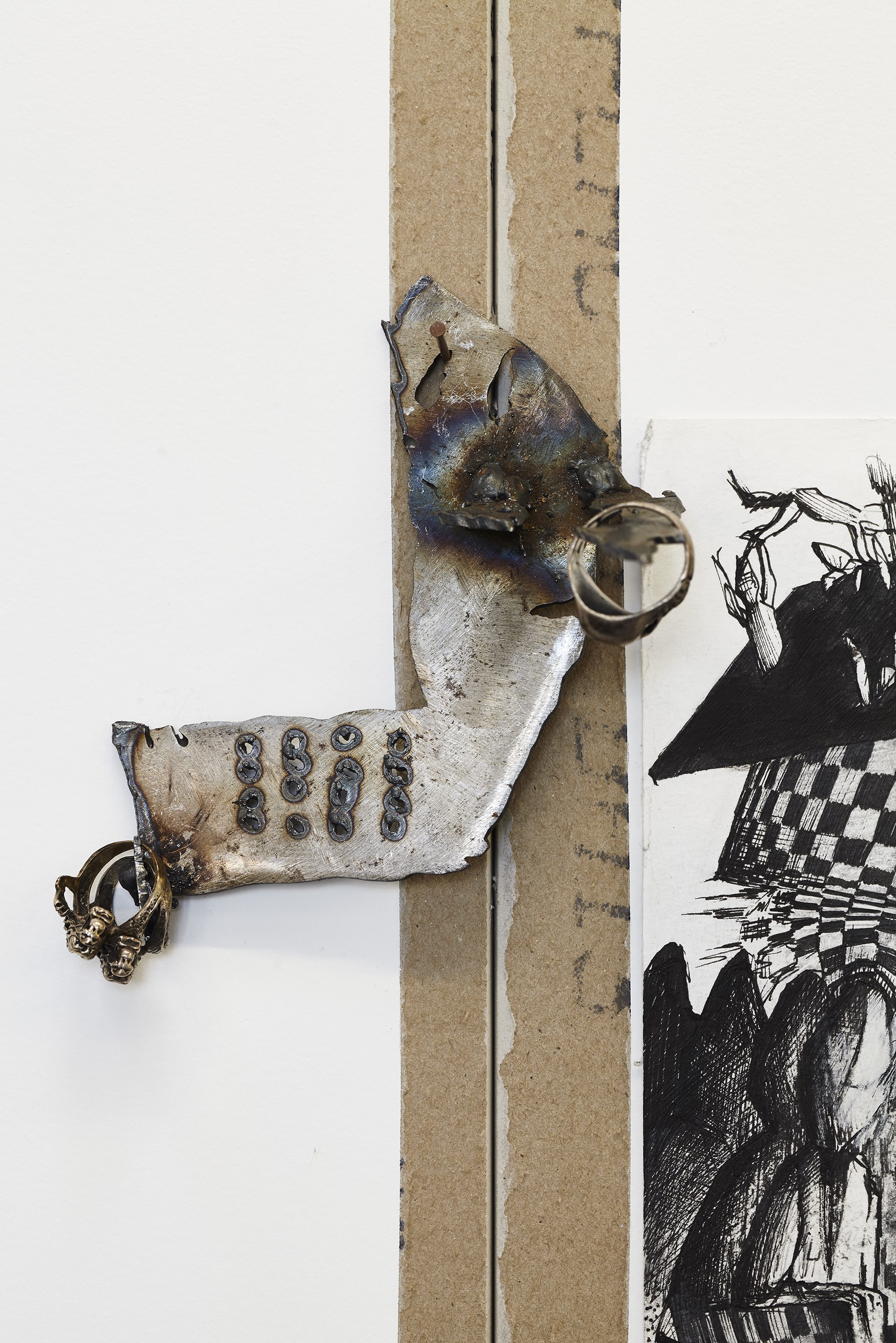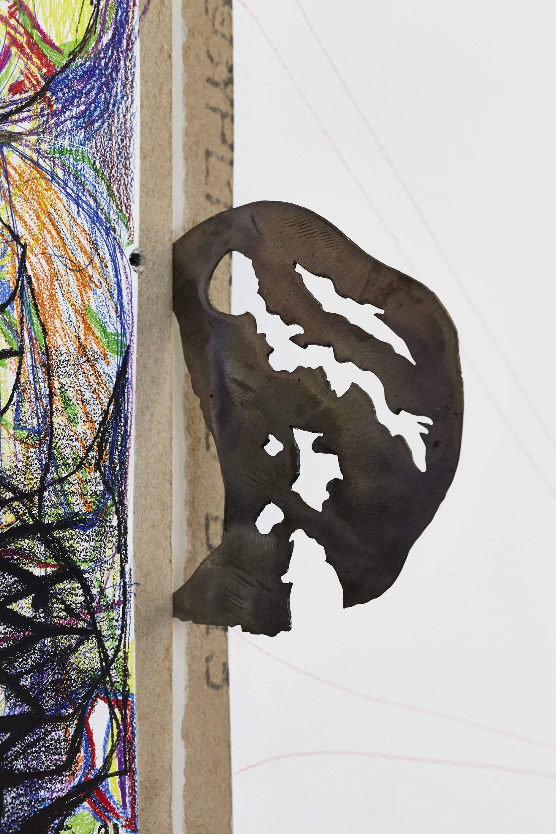The work on paper titled St John (which gives title to the show like some advocation) is embroidered in magnetic cassette tape and nailed to the wall amidst this particularly magnetic intensive atmosphere. Berdugo speaks of this work: I like that John the Evangelist is the volatile one, the oversensitive one, and also the one to whom Jesus entrusted the care of his own mother moments before his death. His gospel is also the most questioned: many doubt that the Gospel of John was actually written by John the Evangelist. I'm interested in this elevated vulnerability of voice and testimony.