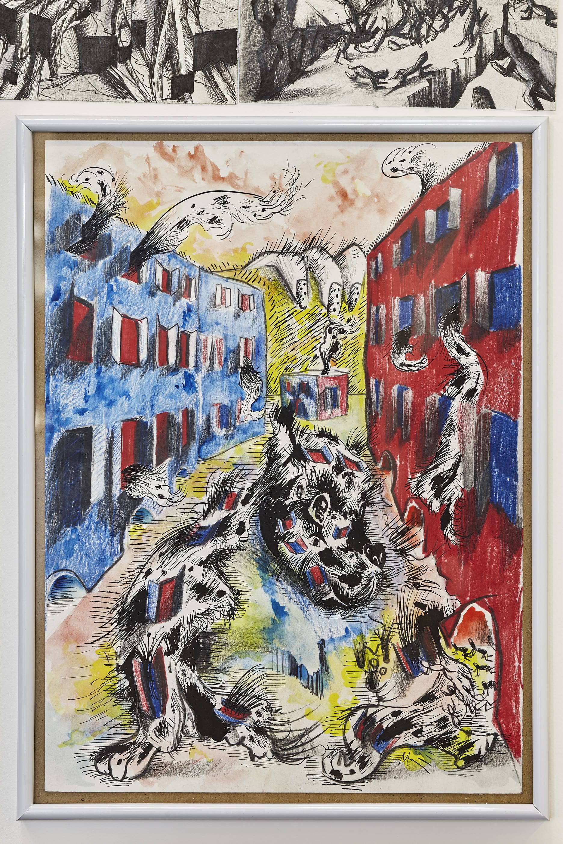 La obra naranja posicionada en el suelo es una réplica a escala de un ‘Elevated Plus Maze’, el ensayo conductual más utilizado para probar las benzodiazepinas en ratones. Cuando el ratón permanece en los brazos del cruce con los lados, significa que su miedo es mayor que su impulso de exploración. Si se aventura a uno de los brazos abiertos, significa que las benzodiazepinas están surtiendo efecto. Para Berdugo, esta forma parece hacer más explícita la relación entre el espacio y la ansiedad. Su naranja vibrante es un contrapunto cálido y externo al laberinto del laboratorio, con siluetas de algunos famosos ratones aventureros y tiernos de la ficción infantil.
