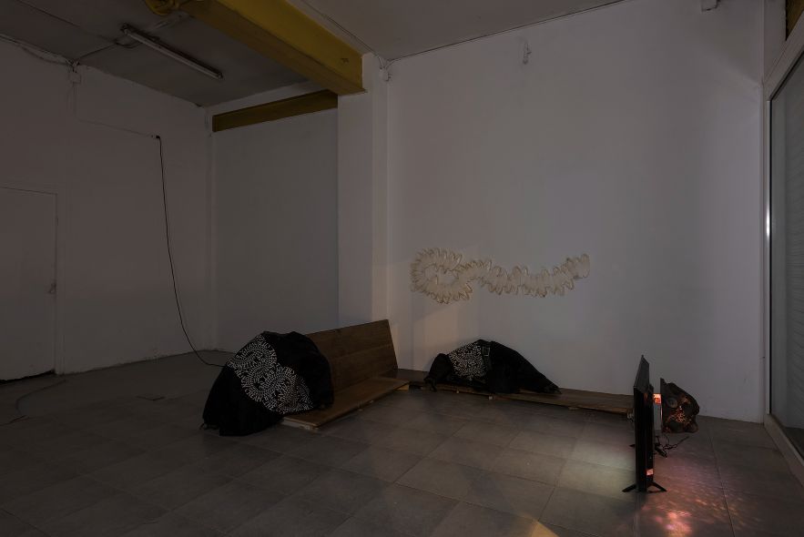 A través de una serie de arreglos escultóricos híbridos, los elementos teatrales que normalmente quedan relegados a un segundo plano se reinterpretan como intérpretes estáticos imbuidos de agencia. Aparejos, telones y asientos —reliquias de innumerables encuentros— se anclan en materiales orgánicos como huesos de resina, piel de raya y alquitrán volcánico. En estado de suspensión, estas formas exponen la labor psíquica de la observación y el fetichismo que ata al público a la performance. A lo largo de las dos salas de la galería, las obras trazan las transgresiones episódicas de feminidad respetable de la madwoman, revisando manuales de domesticidad y creación de espacios con gestos que desafían la contención.