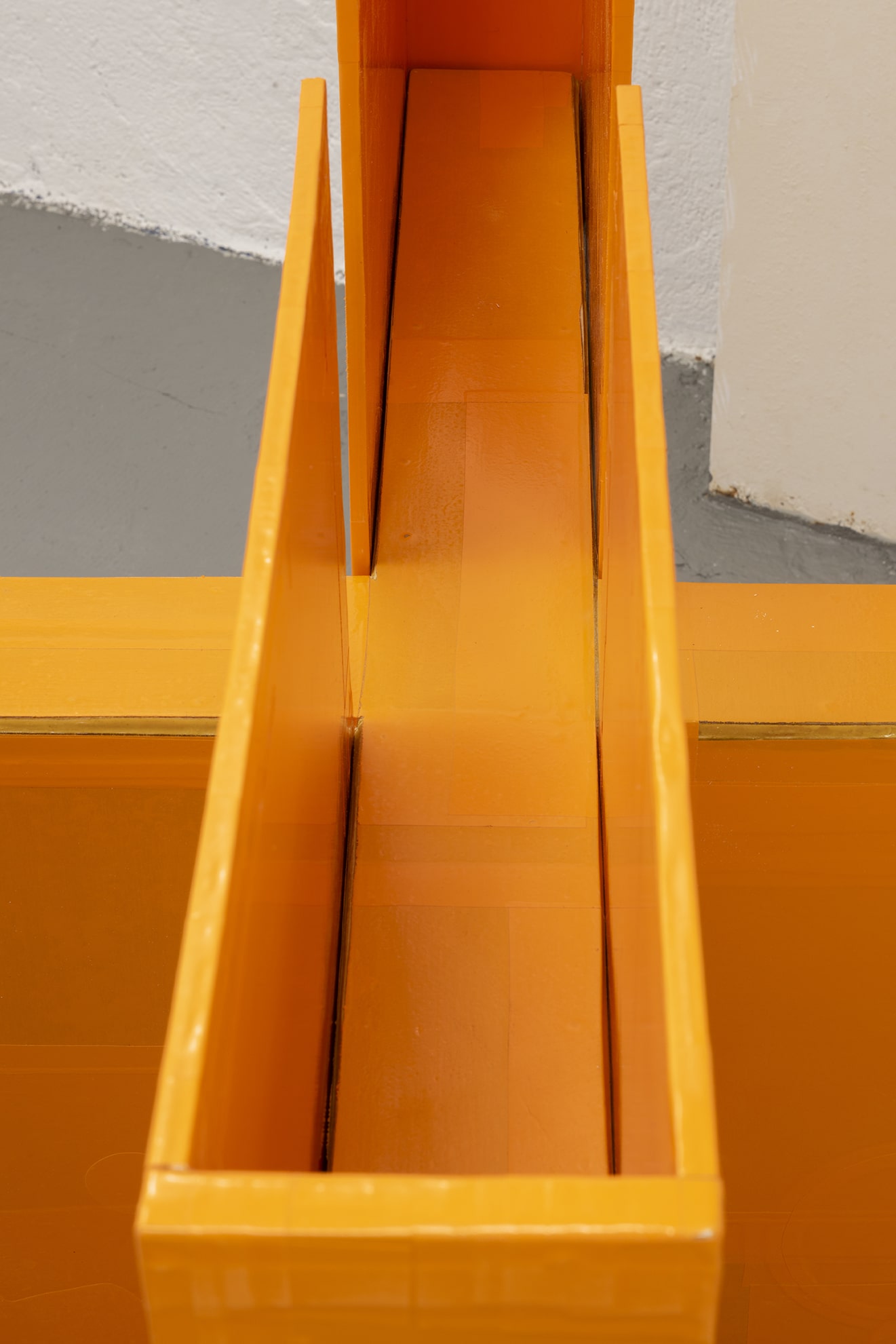 La obra naranja posicionada en el suelo es una réplica a escala de un ‘Elevated Plus Maze’, el ensayo conductual más utilizado para probar las benzodiazepinas en ratones. Cuando el ratón permanece en los brazos del cruce con los lados, significa que su miedo es mayor que su impulso de exploración. Si se aventura a uno de los brazos abiertos, significa que las benzodiazepinas están surtiendo efecto. Para Berdugo, esta forma parece hacer más explícita la relación entre el espacio y la ansiedad. Su naranja vibrante es un contrapunto cálido y externo al laberinto del laboratorio, con siluetas de algunos famosos ratones aventureros y tiernos de la ficción infantil.