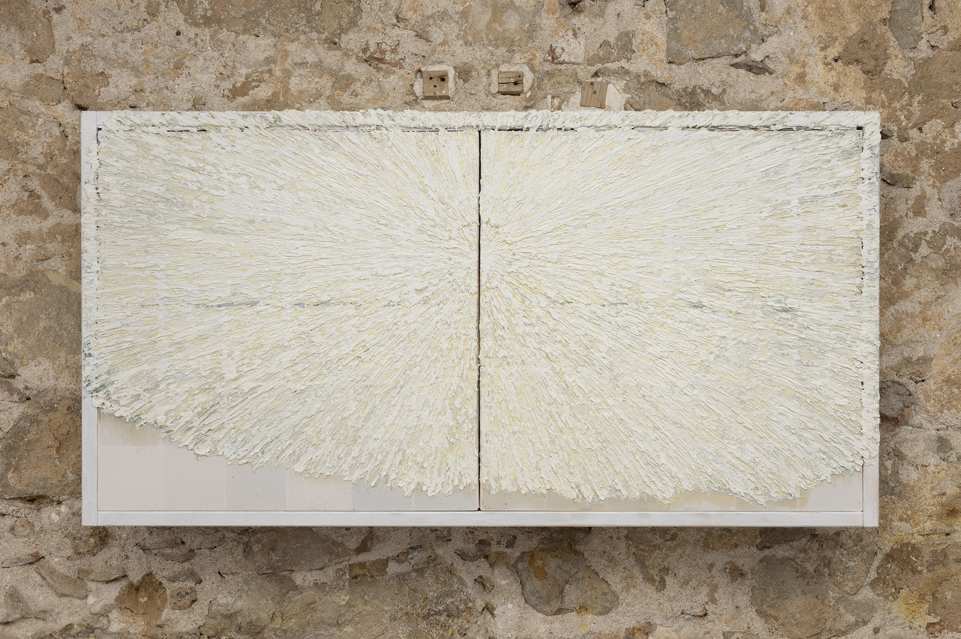 The works in the exhibition maintain a relatively uniform format of approximately 100 x 120 centimeters and are exhibited in a continuous linear arrangement, evoking classical exhibition forms such as the frieze and the panorama. Some of the paintings had their debut in 2024 at Bourse de Commerce as part of Arca’s series of multimedia improvisational performances entitled The Light Comes in the Name of the Voice. The exhibition at Cordova, however, marks a milestone as the first exhibition dedicated exclusively to Arca's visual artwork, presenting several pieces that have not yet been on display.