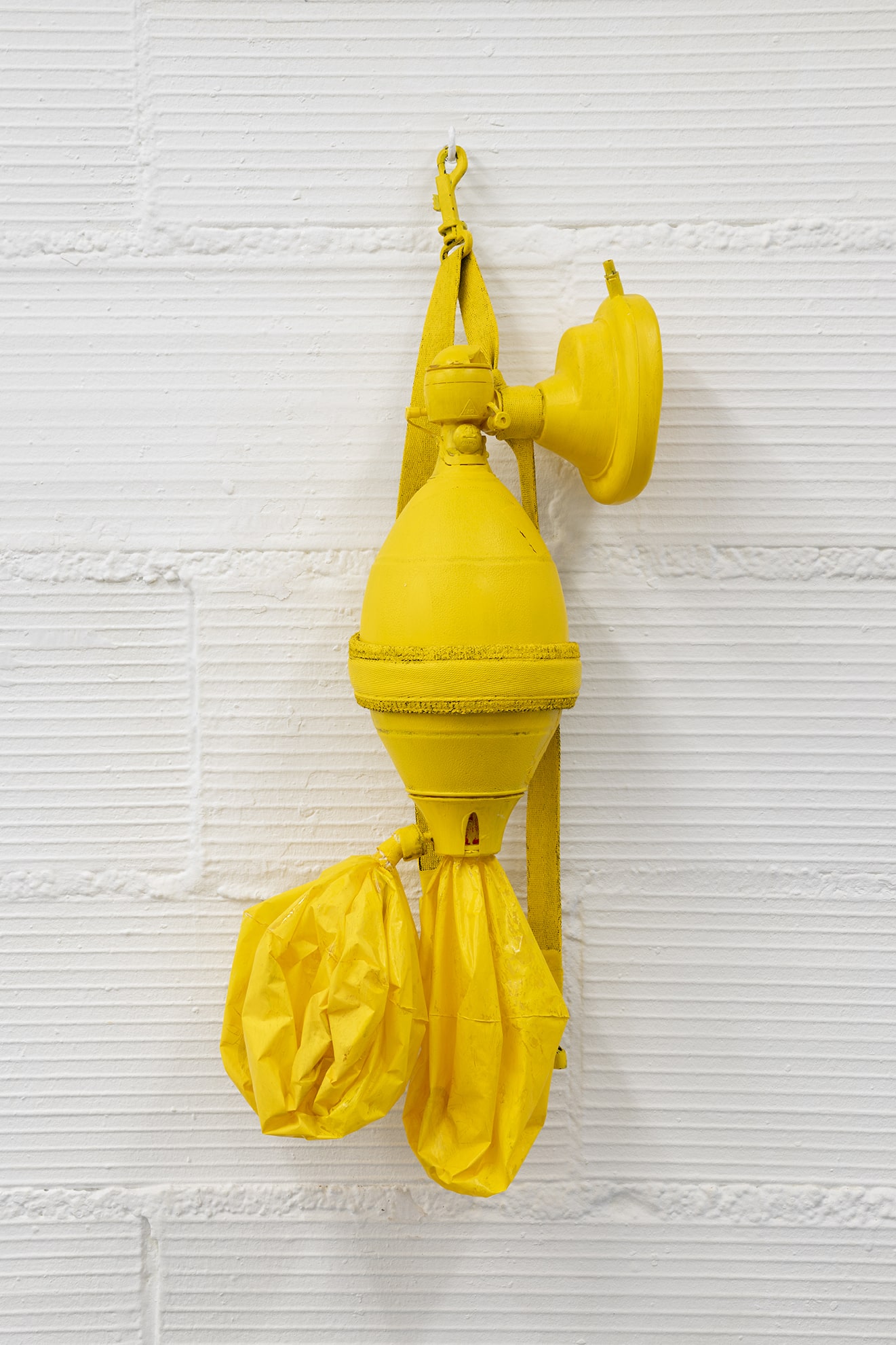 The yellow sculpture is a canary lung, a medical resuscitator adapted to have three bags of air – like the lungs of a canary – rather than just one. The artist is interested in the hypersensitivity of these animals to their environment, the vulnerability that comes from an extra airy respiratory system. Carbon monoxide knocks the birds out in a second, which is why miners took them down with them to the mine in case there were leaks. This sensitivity is paradoxically also what allows them to sing so beautifully.