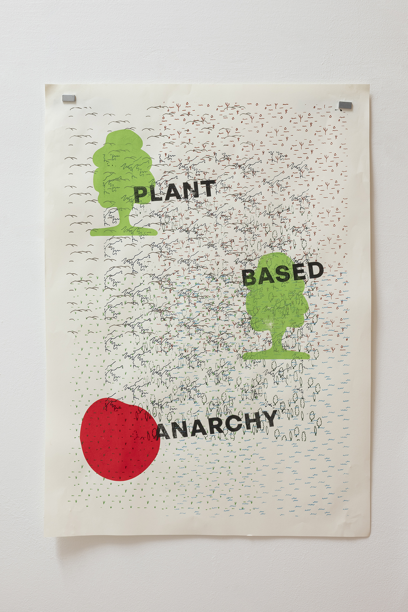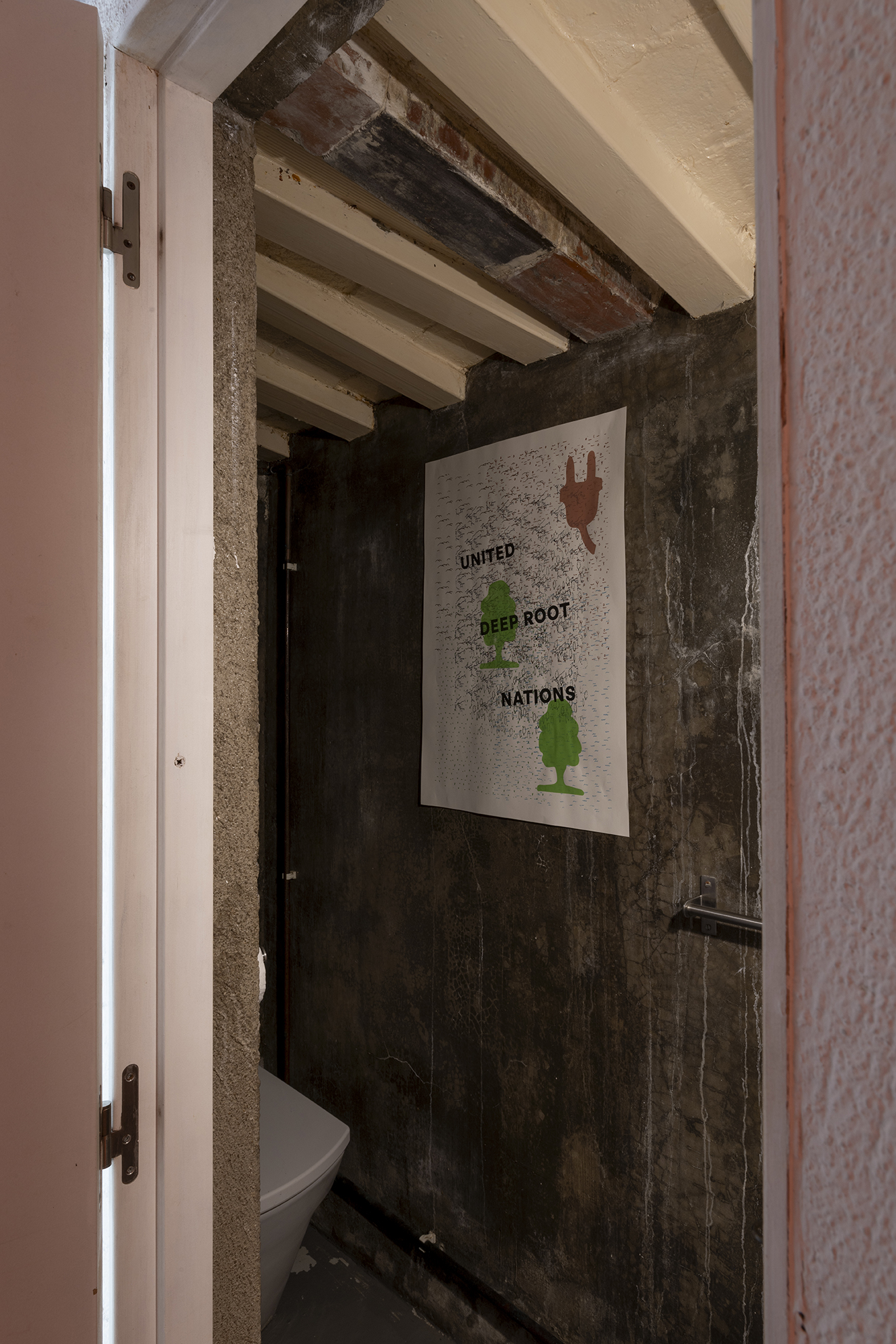 News From Nowhere is a built environment that addresses this paradoxical condition, and the struggle between making and undoing. Jones delimits this site through a triangulation of: a declarative written word ‘Yalancılar’ (Turkish for liars) registered legible from the outside balcony, an elongated undulating sandcastle structure, and the remnants of upheaval, thrown stones and smashed tomatoes. Jones materially and conceptually references both the construction of the termite mound and the process of mothering; the former as a stand in for the city and the universally experienced process of living together, and the later an acutely personally process, identifiable to some (mothers) first hand and others only by proxy. This diorama operates through a shift in scale, and the room holds the citadel and (like and the mound or the womb) it expands, develops and swells and is put in direct contact with the violence of upheaval (the rain the destruction of self). The work advocates for a utopic stability born out of agitation and instability; the moment when the space is dismantled and pulled open wide enough allow what we want to have happen, to happen.