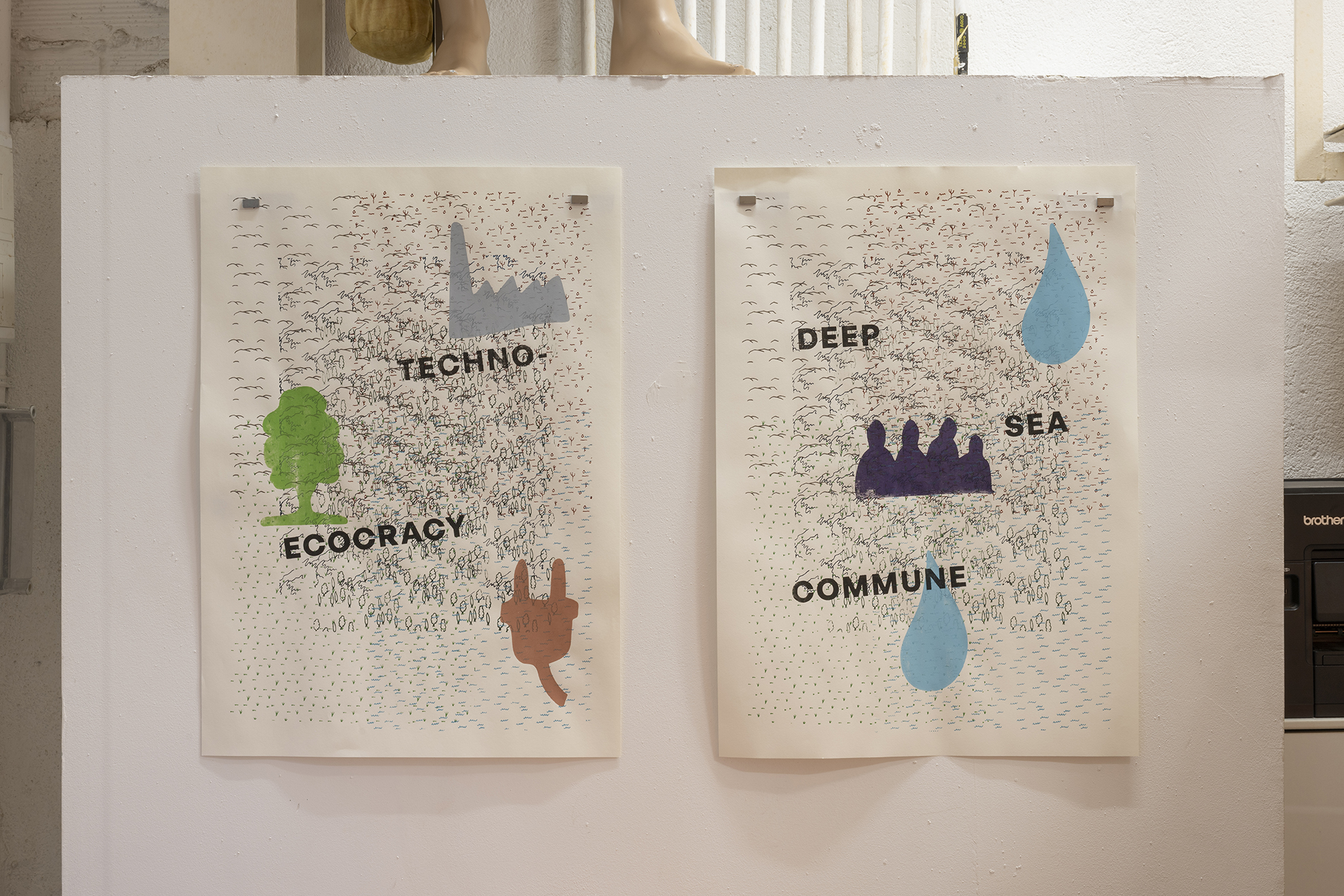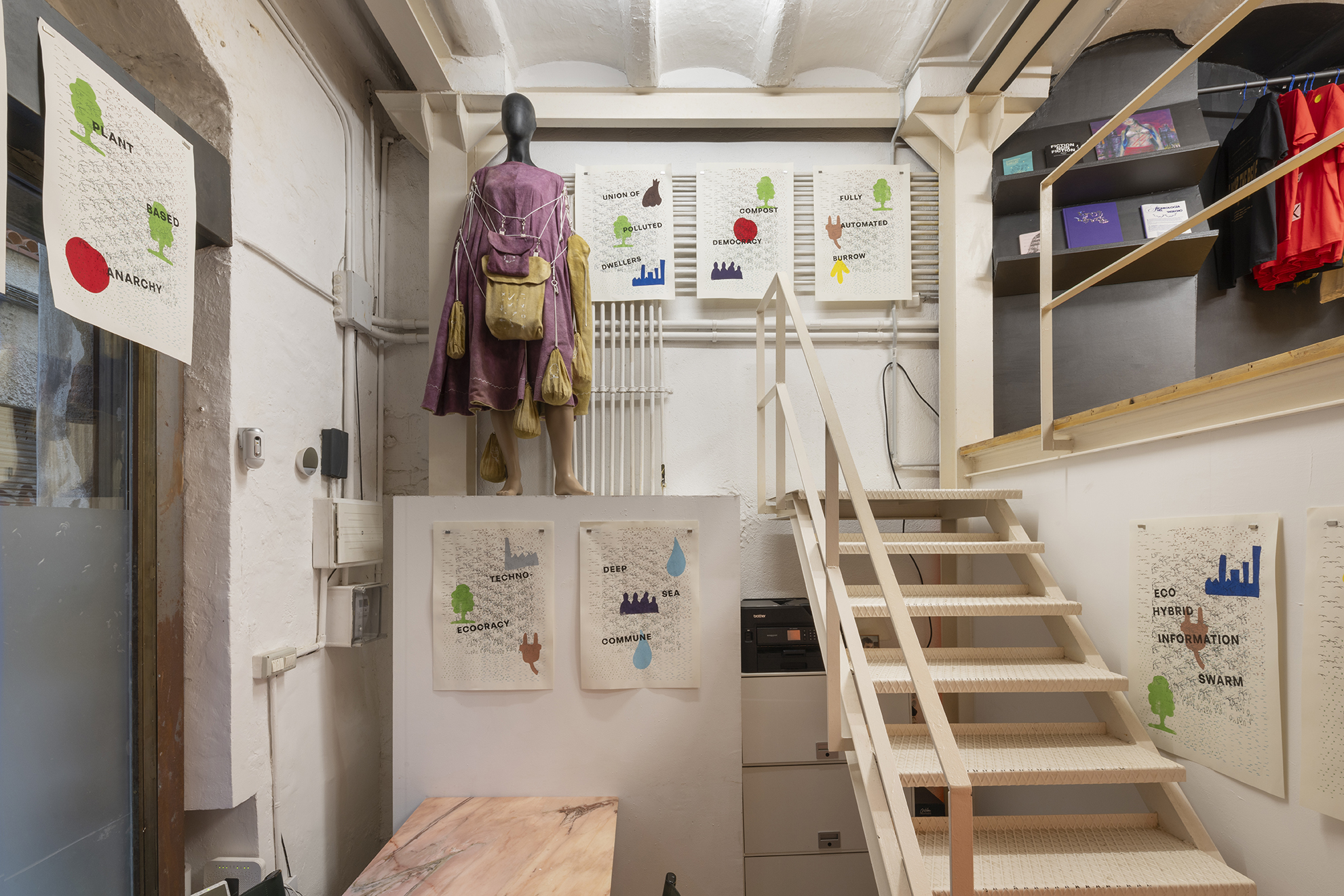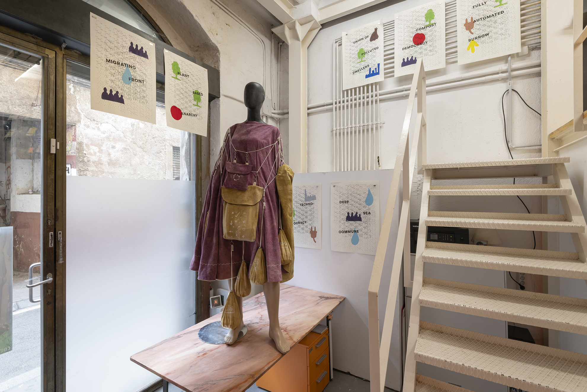 La exposición y la performance, aunque se inspiran en las ideas de Davis, se basan igualmente en el conflicto geopolítico actual, el desastre medioambiental, la fantasía, el cine y la ciencia ficción. Gasser organiza la performance como un encuentro entre tres figuras y, respectivamente, sus correspondientes esculturas y objetos: el científico con traje de materiales peligrosos, el viajero en el tiempo y un humano que lleva una camiseta con el logotipo de las Naciones Unidas. El último personaje representa la potencialidad de una institución representativa mundial como la ONU para facilitar activamente la coexistencia entre los seres humanos y la propia Tierra, independientemente de los intereses nacionales. La obra materializa, y a veces rompe, los límites de nuestra realidad terrestre e imagina una coalescencia entre fuerzas, de y fuera de, este mundo y tiempo.