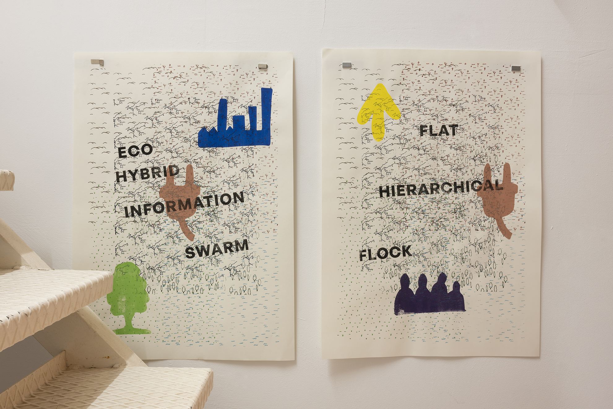 The orange work set on the floor is a to-scale replica of an Elevated Plus Maze, the most commonly used behavioral assay to test benzodiazepines on mice. When the mouse stays on the arms of the cross with sides it means its fear is greater than its drive for exploration. If it ventures to one of the open arms, it means that the benzos are having an effect. For Berdugo, this shape seems to make the relationship between space and anxiety more explicit. Its vibrant orange is a warm and outward counterpoint to the lab maze, with silhouettes of some famous adventurous and tender mice from children's fiction.