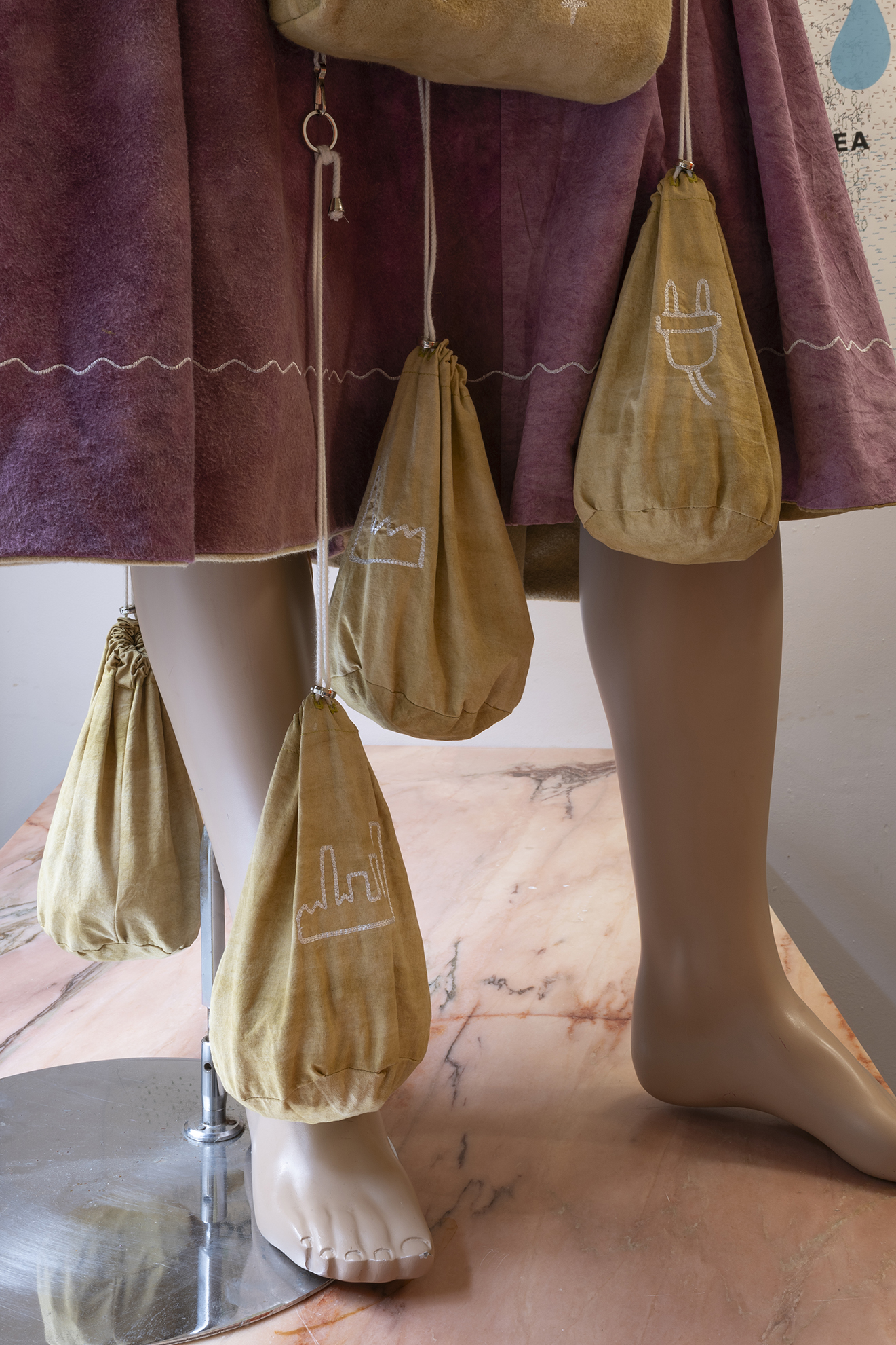 The exhibition and performance, although informed by Davis’ ideas, is grounded equally through current geo-political conflict, environmental disaster, fantasy, film, and science fiction. Gasser orchestrates the performance as an encounter between three figures and respectively and their corresponding sculptures and objects; the hazmat suited scientist; the time-traveler; and a human wearing a shirt with a United Nations logo. The last character represents the potentiality of a global representative institution like the UN to actively facilitate a coexistence between humans and earth itself, irrespective of national interests. The work materializes and at times breaks from the limits of, our terrestrial reality and imagines a coalescence between forces, of and outside of, this world and time.