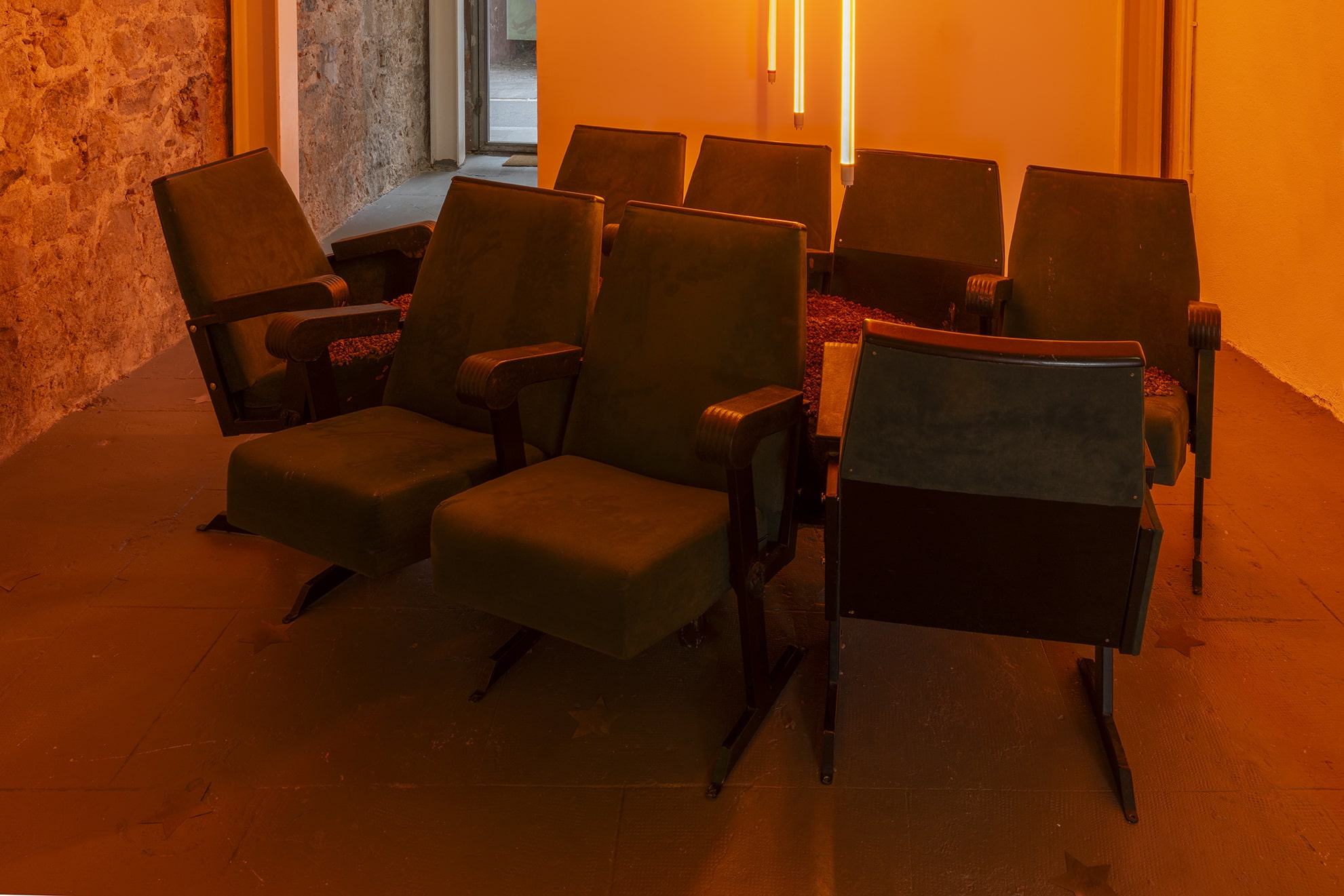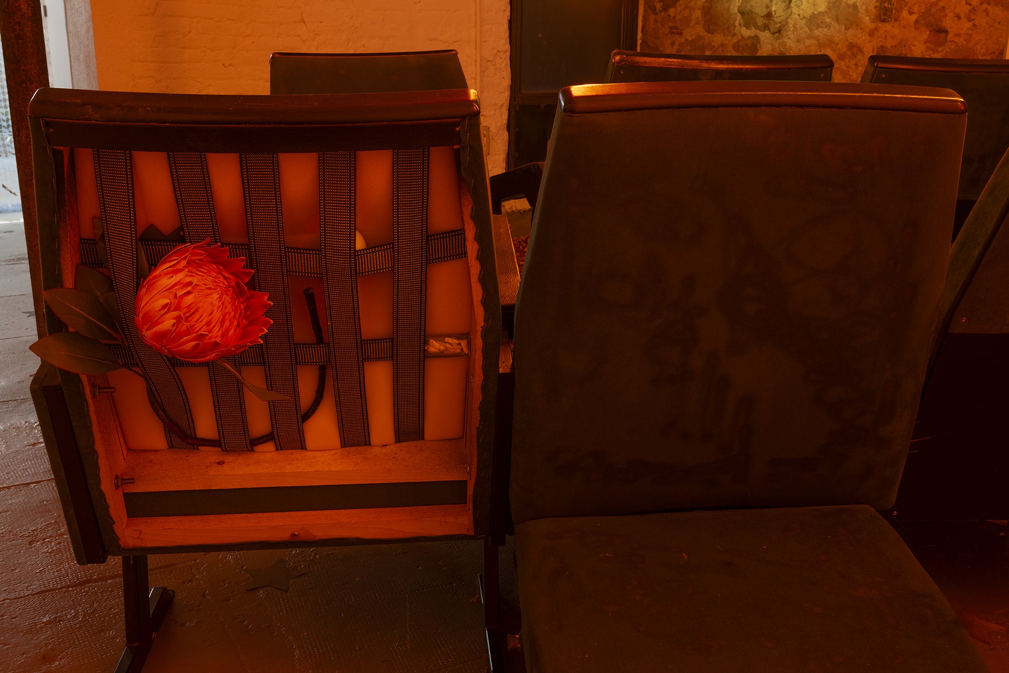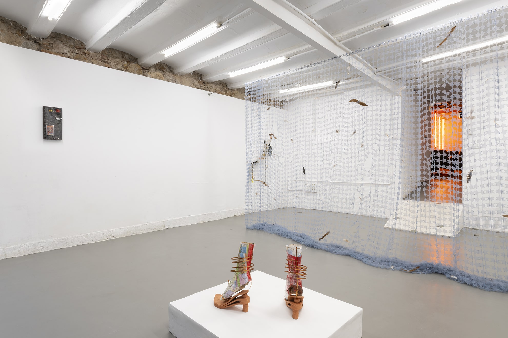 Mitjançant una sèrie d'arranjaments escultòrics híbrids, els elements teatrals que normalment queden relegats a un segon pla es reinterpreten com a intèrprets estàtics imbuïts d'agència. Aparells, telons i seients —relíquies d'innombrables trobades— s'ancoren en materials orgànics com ara ossos de resina, pell de ratlla i quitrà volcànic. En estat de suspensió, aquestes formes exposen la tasca psíquica de l'observació i el fetitxisme que lliga el públic a la performance. Al llarg de les dues sales de la galeria, les obres tracen les transgressions episòdiques de feminitat respectable de la madwoman, revisant manuals de domesticitat i creació d'espais amb gestos que desafien la contenció.