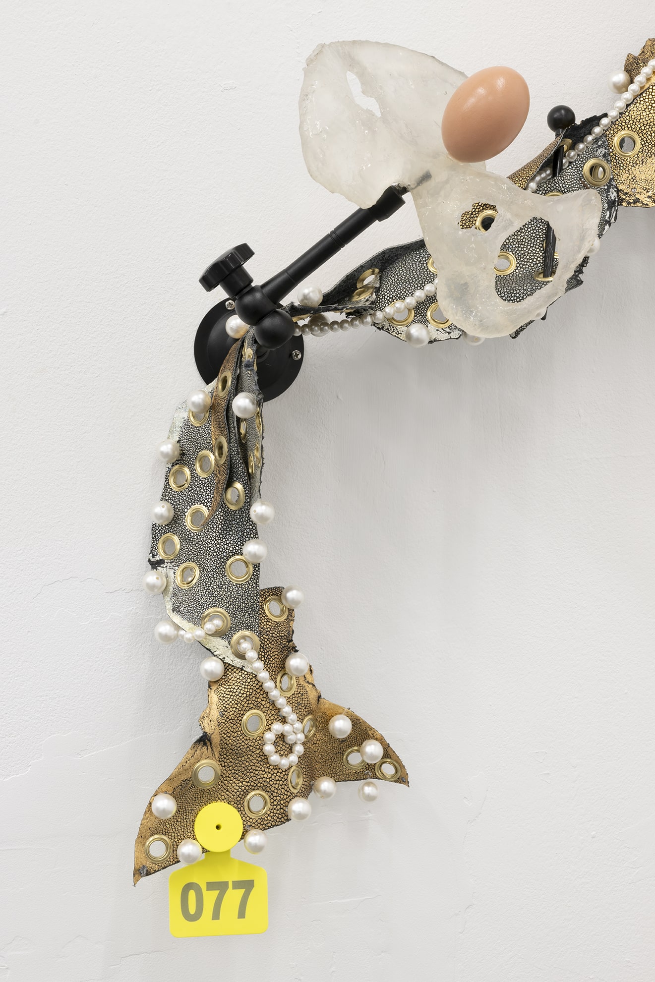 Through a series of hybrid sculptural arrangements, theatrical fixtures that usually recede into the background are recast as static performers imbued with agency. Rigging, curtains, and seating—relics of countless encounters—are tethered to organic materials like resin bones, stingray skin, and volcanic tar. In a state of suspension, these forms expose the psychic labor of witnessing and the fetishism that binds an audience to performance. Across the gallery’s two rooms, the works trace the madwoman’s episodic transgressions of respectable femininity, revising manuals of domesticity and place-making in gestures that defy containment.
