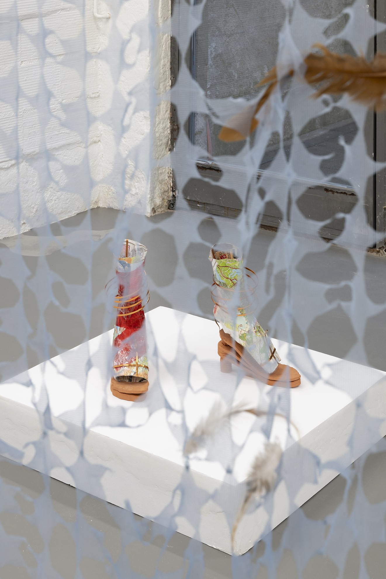 Duty Free is a site-specific exhibition by multidisciplinary artist Jiajia Zhang. Using installation, sculpture, found objects, sound, vinyl window coverings and text the artist stages a strange and temporary storage space. A place for discarded goods and wholesale products, found furniture and altered objects, past memories and future predictions. Fragments of music and voices speaking in different accents can be heard emanating from some of the objects scattered throughout the space. The voices read an incomplete inventory of mundane activities and daily chores. While the listed activities are both banal and specific, both busy and stagnant, the objects – which usually are traded, delivered, exchanged, discarded, or recycled – lie peacefully still, covered, uncovered, withstanding for a moment the erosion of time. Zhang asks questions about abandonment and entertainment, bureaucracy and care.