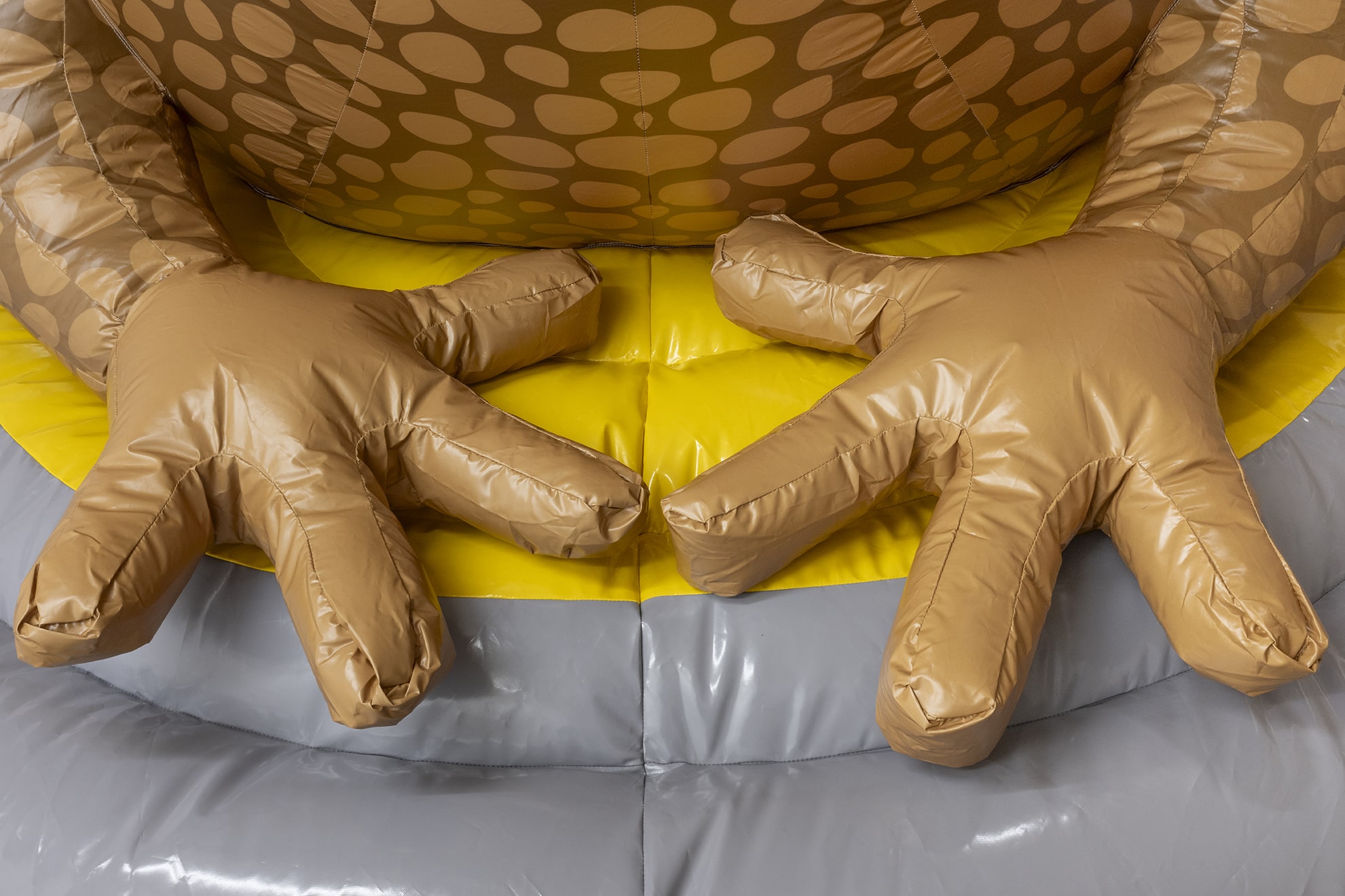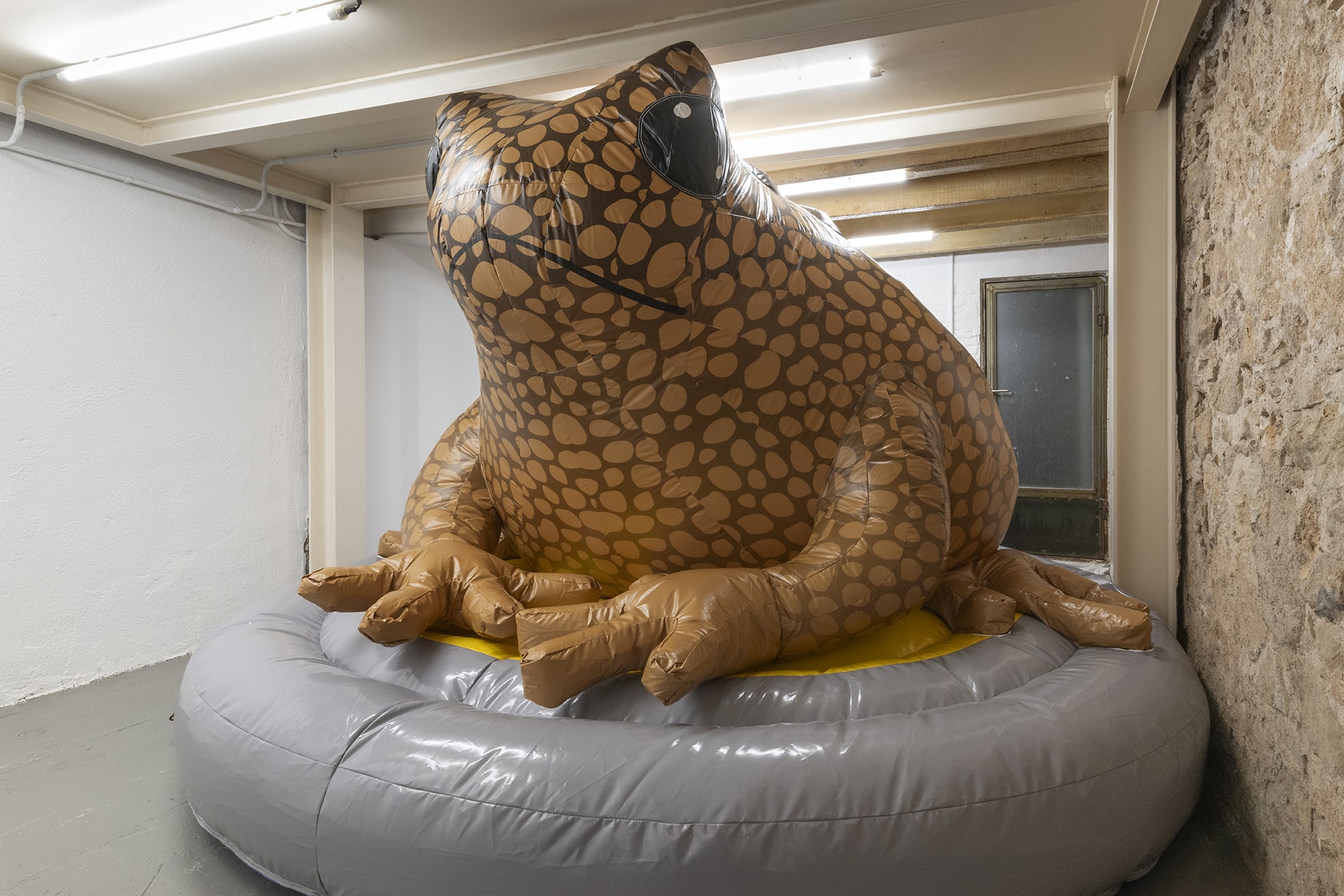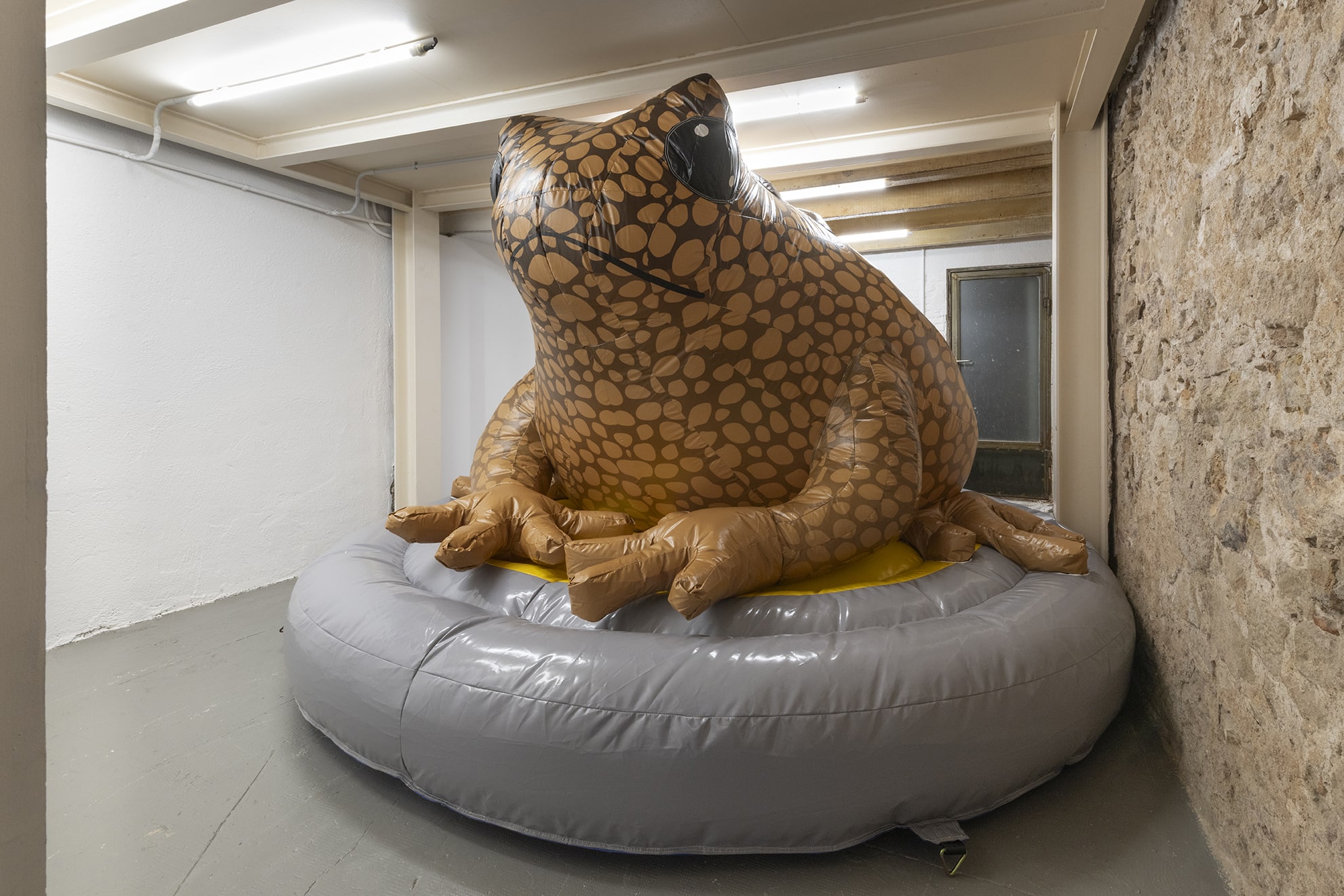 Bad To The Bone is a solo exhibition with two new sculptural works by Emily Jones. In the first room there is a larger than life inflatable toad sat atop an similarly oversized coin. While the toad and the coin may seem disparate, tiny frogs are often photographed on top of coins in order to show their exact size. The coin is a common object that we collectively agree upon as having a certain size (and value) and hence it serves as a reliable reference, a fixed truth verifying the size of often unbelievably small animals. In many instances both frogs and toads are thought to bring good fortune, as is the case with the ‘Jin Chan’ or “money toad," a popular feng shui charm where a toad sitting on a pile of coins is thought to bring luck and prosperity. Scale is a recurrent theme in the artist’s work and in this case the size of the coin and toad duo borders on monumental.