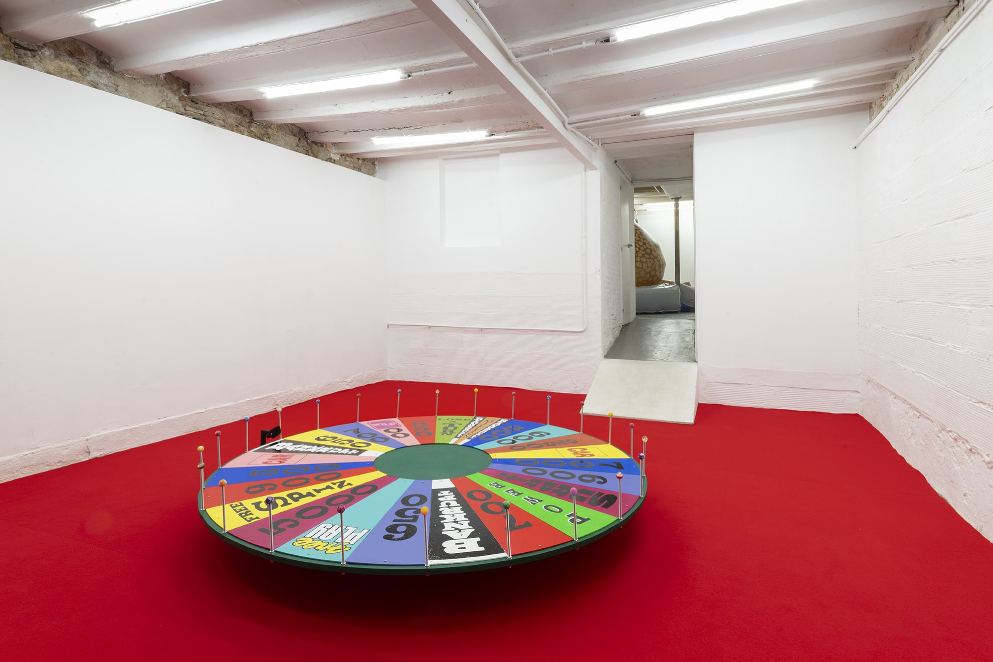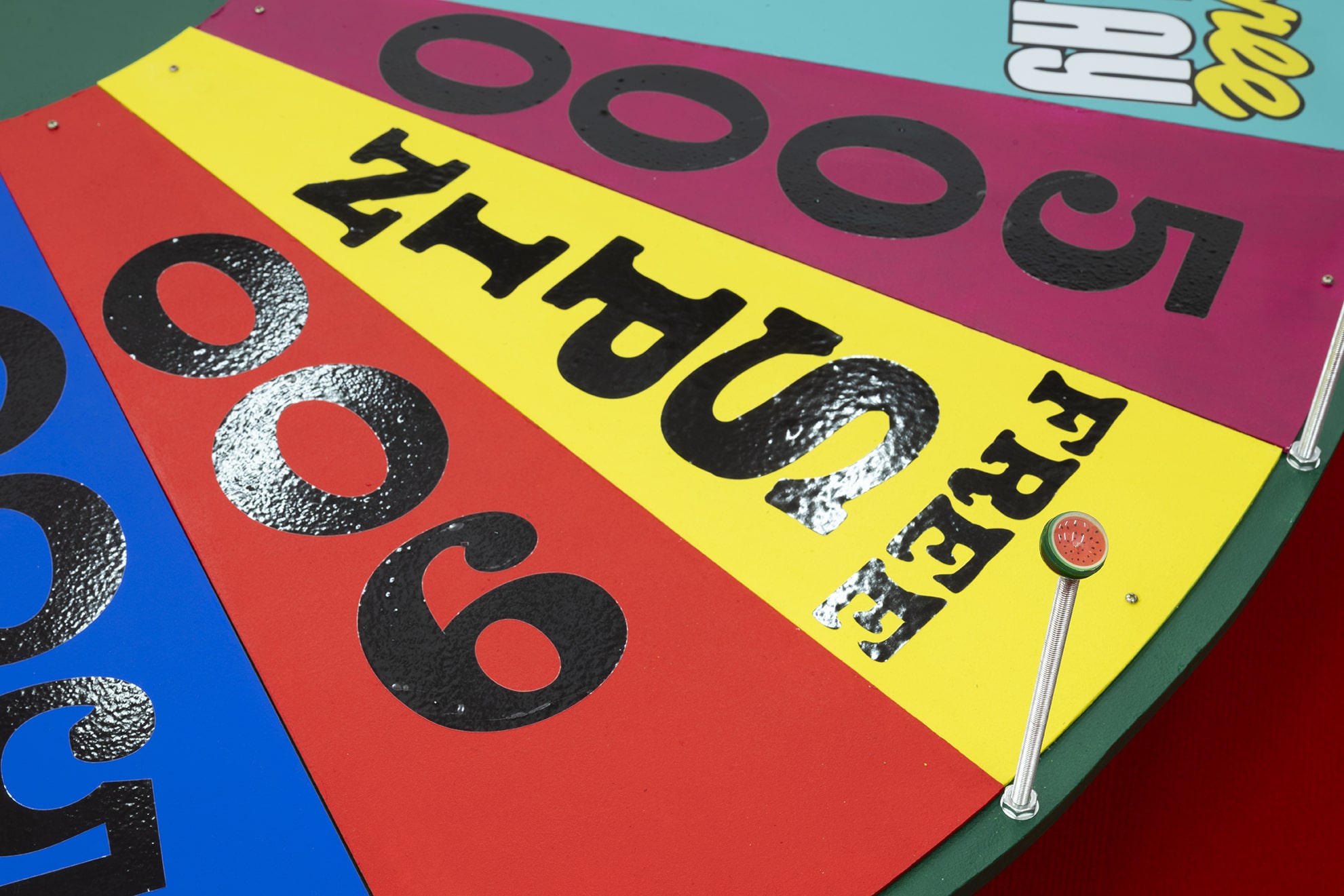 In the second room there is a functional wheel of fortune positioned atop a bright red carpet. The wheel’s proportions and twenty four distinct slices have been modeled as an approximation of the wheel used on “Wheel of Fortune,” a popular television game show in the United States which has been on the air in some form since 1975. The format of the wheel is said to be a mixture of two common casino games: the ‘Big Six’ which is usually positioned vertically and contains various segments and the pins around its border, and the classic Roulette table, where the circular table is spun in one direction and a small ball in the other, eventually stopping on a particular value. Jones chose not to include the dollar sign symbol on the wheel as to allow the numbers to be less tethered to a specific place and currency. While there are no prizes in this version of the wheel of fortune, visitors are still encouraged to take a risk, spin the wheel and to test their chances.